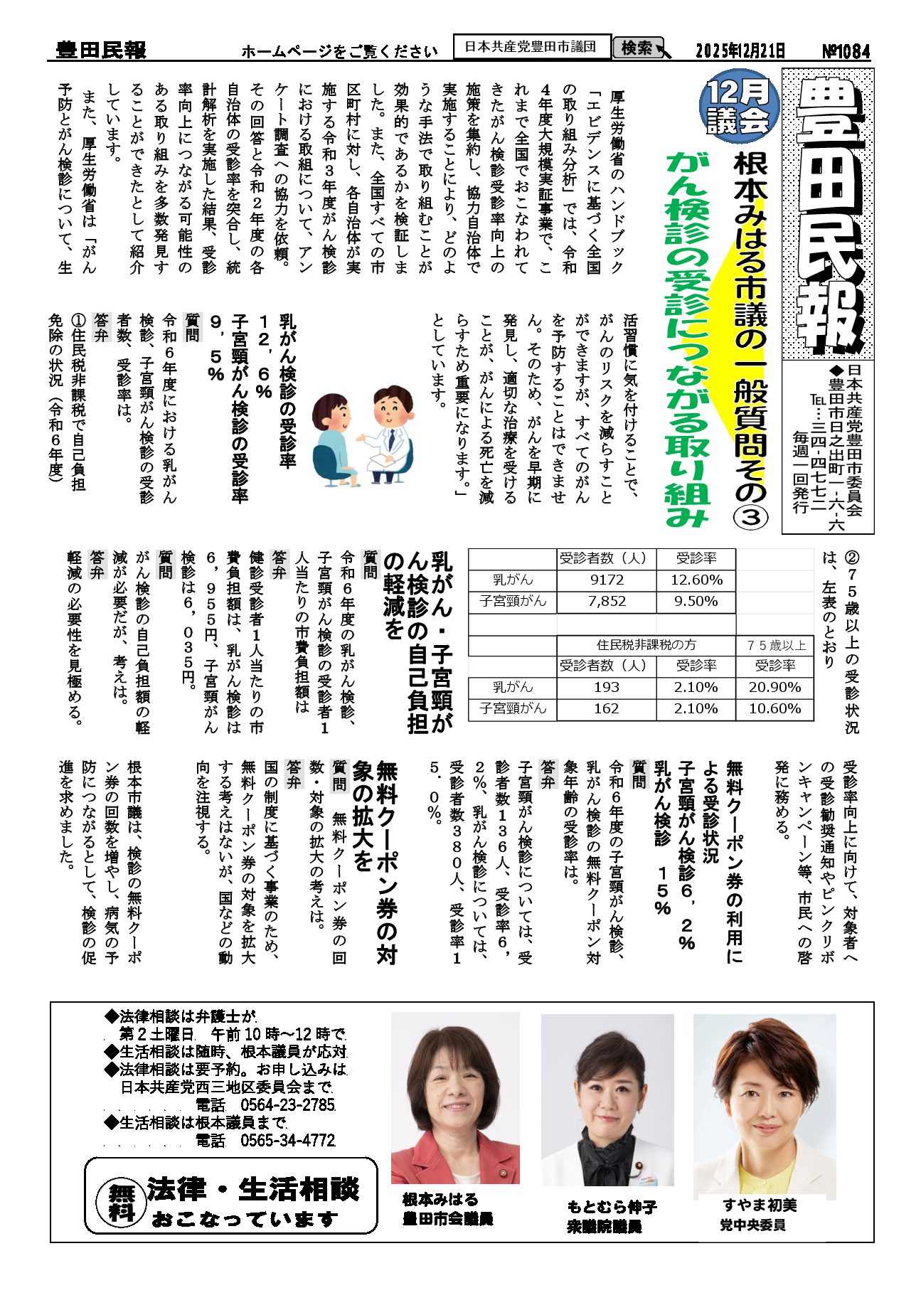 2025年9月28日発行。「なくそう!日米軍事同盟・米軍基地 2025日本平和大会イン愛知」を開催。10/25(土) 13時~15時:開会集会、名古屋市民会館 金山駅前。16時~18時「学びと交流のつどい」。26日(日):テーマ別分科会。 9月議会2024年度決算質疑:財政調整金414億円の活用を、物価高騰で限界に達する市民への負担軽減に活用すべき。要望のあった小中学校84校のトイレに生理用品の配備、どの学校でも生理用品のトイレへの配備が必要です。 9月16日民青同盟が学生食糧支援。30人の学生さんが参加。「米、助かります」などの声。早急に学費無償化の実現が望まれます。 お知らせ:3日行動、10月3日(金)午後1時~豊田市駅東デッキにて。