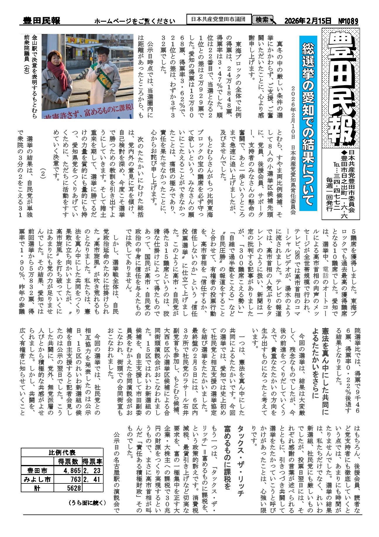 2026年1月11日発行。戦争阻止 野党が共同街宣(25年12月28日一宮市)軍需産業の集積地愛知から平和と希望をつなぐ。台湾発言であらわになる高市政権の危険な本性。日本共産党、立憲民主党、社会民主党、緑の党、新社会党の各党が共同で街宣、れいわ新選組はメッセージ寄稿。 軍事より、くらし・福祉優先の政治を、1月2日挙母神社前で新年宣伝。もとむら衆議院議員、根本みはる市議が参加。医療・福祉に手厚い予算を訴え、市民のみなさんと力を合わせて市政を動かすと決意表明。 トランプ米政権によるベネズエラ攻撃:国際法違反は許されない:日本共産党田村智子委員長の発言。 お知らせ:19日行動、1月19日(月)12時30分~市駅西マック横広場、主催:9条改憲NO豊田市民アクション。