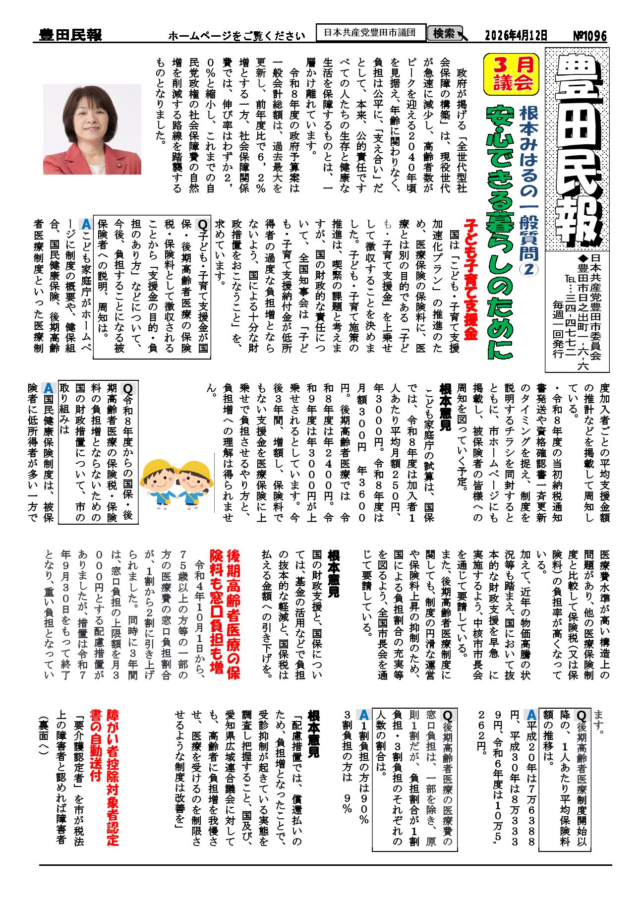 2026年2月22日発行。3月市議会根本みはる市議の質問 2月26日(木)午後2時10分頃 1.被爆者の証言と記憶の伝承 (1)核兵器禁止条約について (2)被爆者の証言と記憶の伝承 (3)学校教育における証言・伝承活動・平和教育 2.安心できる暮らしのために (1)子ども子育て支援 (2)後期高齢者医療について (3)障がい者控除対象者認定書 (4)エアコンの購入助成制度 高市政権の暴走止める日本共産党:総選挙の結果、自民党が衆議院で3分の2を占めるもと、共産党は高市政権の暴走に歯止めをかける決意。 投稿:愛知県来年度に開校準備:豊田西高校の中高一貫の問題点 緊急街宣 2/21(土)18:00~名鉄東岡崎駅南口 NO HATE & 憲法を守る! 西三河真ん中世代