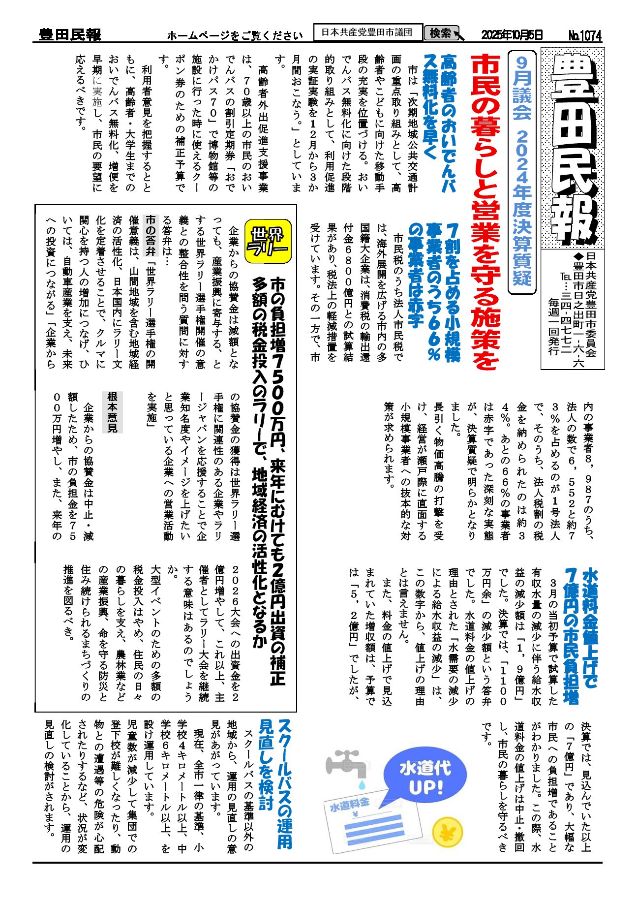 2025年10月5日発行。9月議会2024年度決算報告:高齢者のおいでんバス無料化を早く。市内の事業者7割を占める小規模事業者のうち66%の事業者は赤字、抜本的な対策を。水道料金の値上げで7億円の市民負担増、市民の暮らしを守るべき。世界ラリーは市の負担増7500万円、来年にむけても2億円出資の補正、住民の暮らし・農林業などの産業振興などの推進を。 節約?もう限界、消費税減税を与野党に実行を迫りましょう。 あいち自治体キャラバン事前学習会のお知らせ:10月5日(日)午後2時~豊田市福祉センターにて。