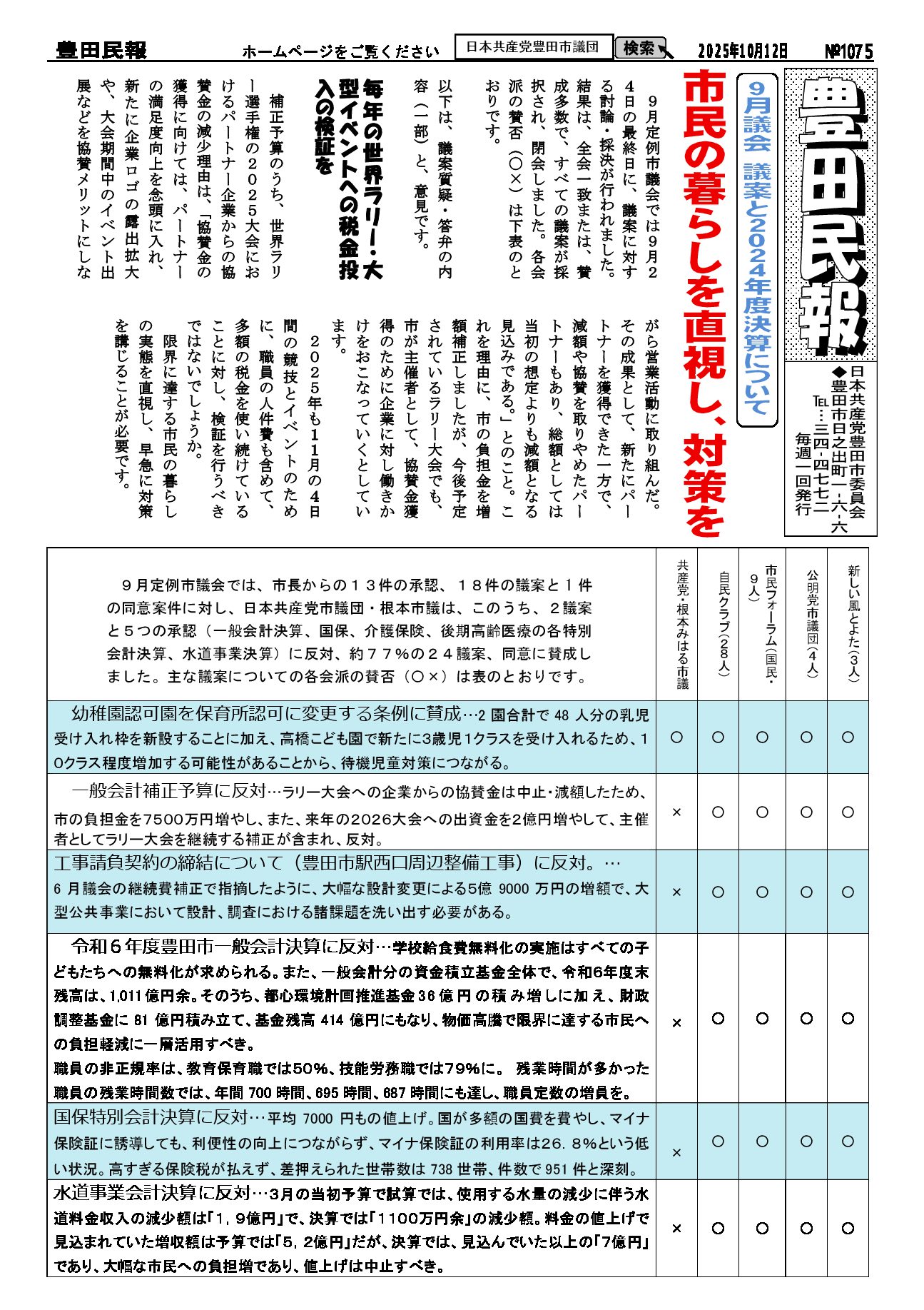 2025年10月12日発行。9月議会 議案と2024年決算について:市民の暮らしを直視し、対策を。9月定例市議会の議案では、市長からの13件の承認、18件の議案と1件の同意案件に対し、根本市議はこのうち、2議案と5つの承認(一般会計決算、国保、介護保険、後期高齢医療の各特別会計決算、水道事業決算)に反対、約77%の24議案、同意に賛成しました。主な議案についての各会派の賛否(〇✕)の一部を表に示す。 お知らせ:2025年日本平和大会in愛知、10/25~26 全体集会、分科会 参加費1日1000円。 19日行動:10/19(日)午後1時~ 原発ゼロ金曜行動10/10(金)10/24(金)午後6時~。
