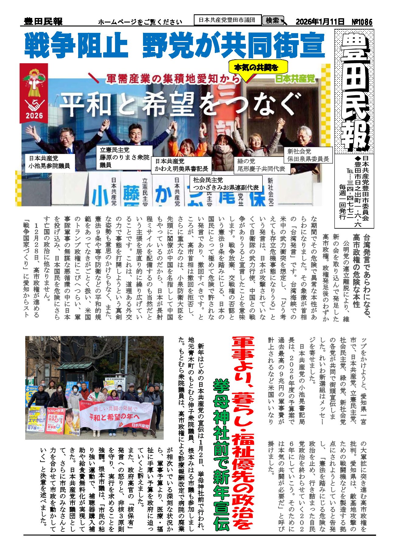 2026年1月11日発行。戦争阻止 野党が共同街宣(25年12月28日一宮市)軍需産業の集積地愛知から平和と希望をつなぐ。台湾発言であらわになる高市政権の危険な本性。日本共産党、立憲民主党、社会民主党、緑の党、新社会党の各党が共同で街宣、れいわ新選組はメッセージ寄稿。 軍事より、くらし・福祉優先の政治を、1月2日挙母神社前で新年宣伝。もとむら衆議院議員、根本みはる市議が参加。医療・福祉に手厚い予算を訴え、市民のみなさんと力を合わせて市政を動かすと決意表明。 トランプ米政権によるベネズエラ攻撃:国際法違反は許されない:日本共産党田村智子委員長の発言。 お知らせ:19日行動、1月19日(月)12時30分~市駅西マック横広場、主催:9条改憲NO豊田市民アクション。