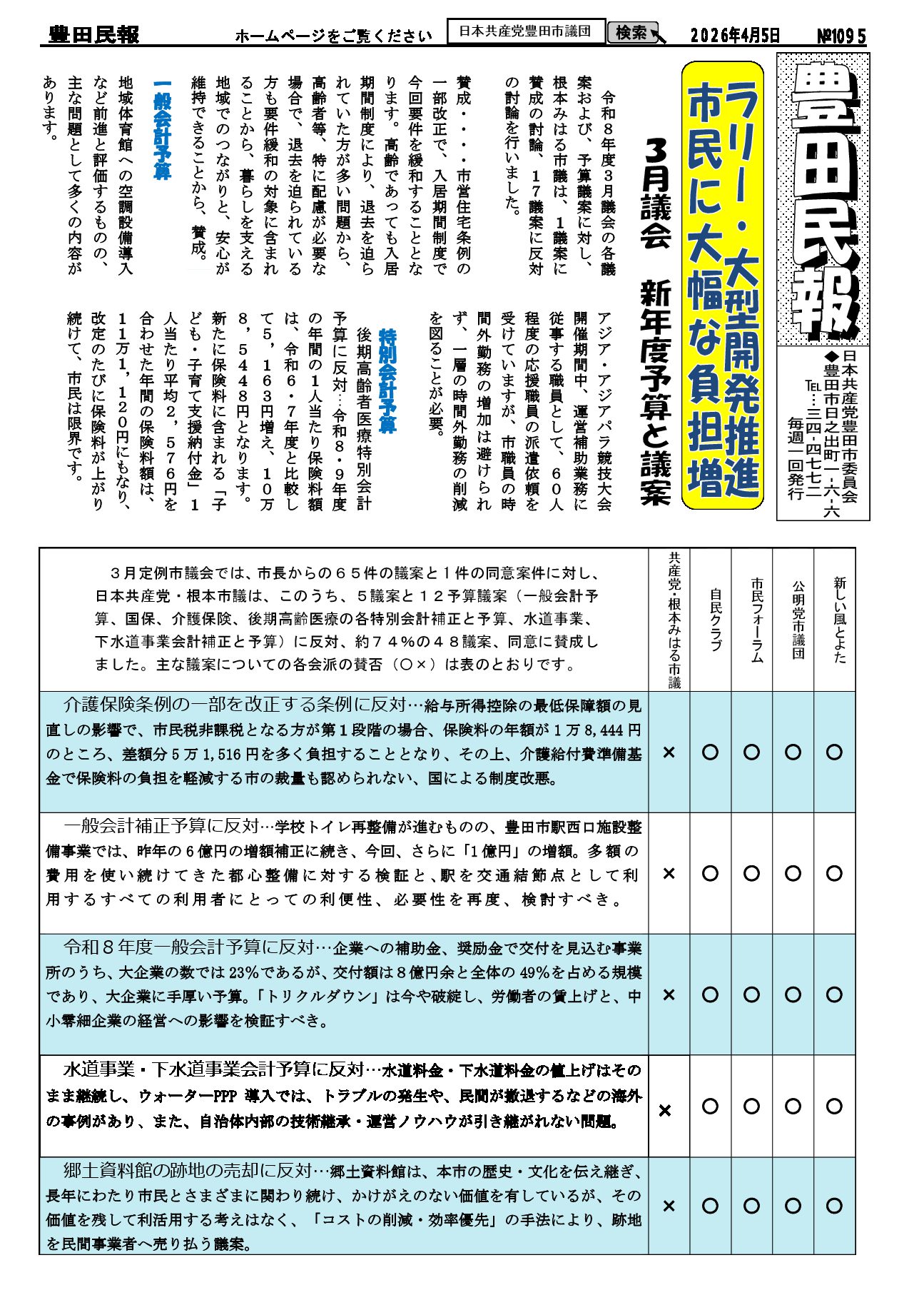 2026年4月5日発行。ラリー・大型開発推進、市民に大幅な負担増:3月議会新年度予算と議案。根本みはる市議は1議案に賛成、17議案に反対討論。主な議案についての各会派の賛否を表示。 18歳の市民の個人情報を無断で自衛隊に:広報とよた4月号(p.18)に「希望しない場合は申出を」とあります。明確な根拠のない名簿の提供は、プライバシー権の侵害、個人情報保護法などに違反するとして名簿提供違憲訴訟も起きています。 ★お知らせ 原発ゼロ金曜行動、4月10日(金)18:00~豊田市駅西マック前 ★★オンライン中継:4月11日(土)14:00~志位議長。