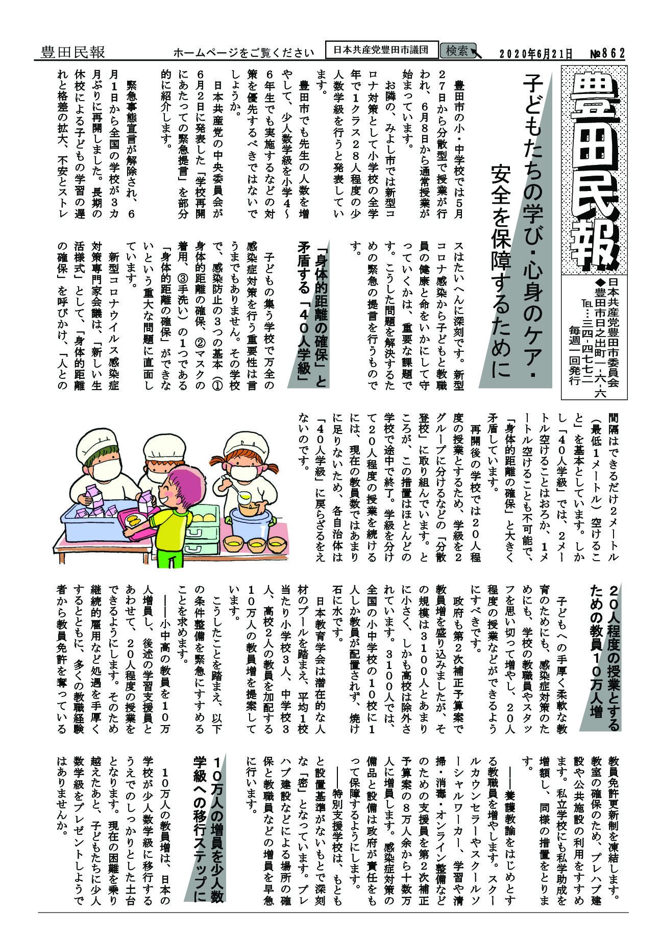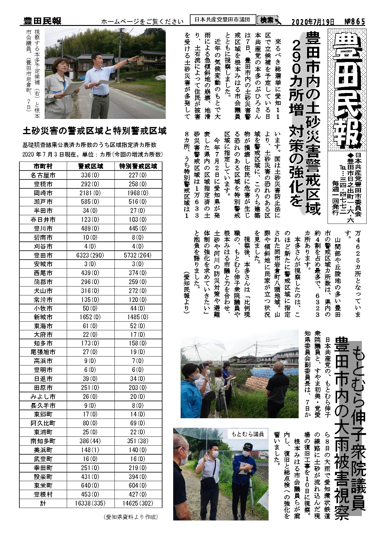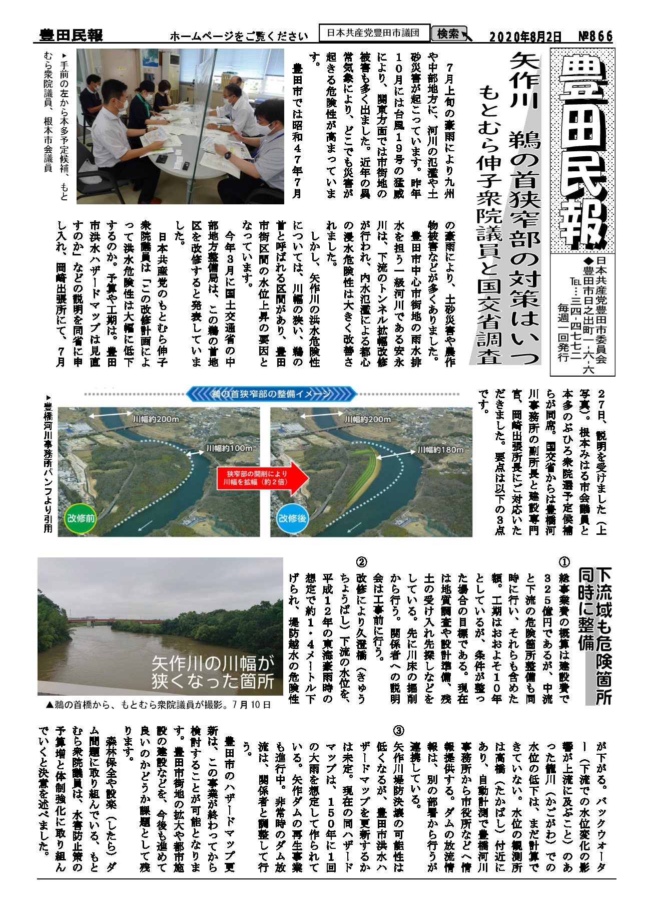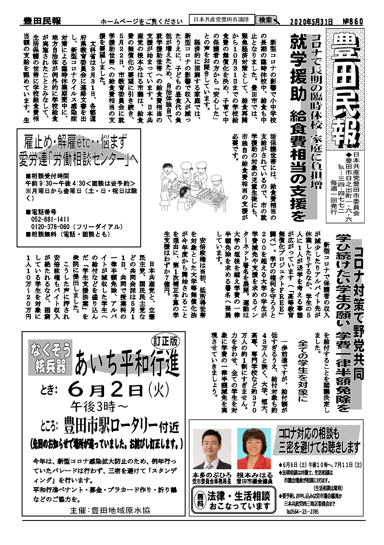 以下をクリックするとファイルが絞り込まれます すべてのカテゴリ 豊田民報 豊田民報号外など 豊田民報 2020.08.03 2020.08.02豊田民報No.866 ダウンロード 2020年8月2日発行。矢作川 鵜の首狭窄部の対策:もとむら伸子衆院議員と国交省調査。県営水道 値下げ要望、新型コロナ対策拡充を。南部休日救急内科診療所が開設、「南部に救急医療を」を求める声。(1MB) 豊田民報号外など 2020.07.26 豊田民報7,8月号外 ダウンロード 日本共産党・6月市議会の報告:GIGAスクール構想、急な前倒し。タブレットより小人数学級を。新型コロナウィルス感染症から市民のいのち・暮らし・営業を守るための緊急要請。(845KB) 豊田民報 2020.07.17 2020.07.19豊田民報No.865 ダウンロード 2020年7月19日発行。豊田市内の土砂災害警戒区域290か所増、対策の強化を。もとむら伸子衆院議員ら、豊田市内の大雨被害視察。新型コロナの対策で市教育部に子どもたち・教員への配慮とケアを申し入れ。(1MB) 豊田民報 2020.07.06 2020.07.05豊田民報No.864 ダウンロード 2020年7月5日発行。コロナ対策、世論と国会論戦で前進。もとむら伸子衆院議員、今国会の前進面と問題点を語る。衆院選愛知11区予定候補本多のぶひろ氏を発表。(357KB) 豊田民報 2020.06.28 2020.06.28豊田民報No.863 ダウンロード 2020年6月28日発行。GIGAスクール構想:急な前倒し、タブレットより小人数学級を。博物館の新築計画は見直し・工事延期を。市営住宅は建て替えで22戸も減るのは問題。コロナ危機:乗り越え新しい日本を、日本共産党の号外より。(799KB) 豊田民報 2020.06.21 2020.06.21豊田民報No.862 ダウンロード 2020年6月21日発行。子どもたちの学び・身心のケア・安全を。「身体的距離の確保」と矛盾する40人学級。20人程度の授業とするため教員」10万人増を提案。(2面は東海ブロックニュース6月号外:コロナ対策、みなさんの声を、国政に届けて)(1MB) 豊田民報 2020.06.12 2020.06.14豊田民報No.861 ダウンロード 2020年6月14日発行。核兵器のない世界を、平和行進が豊田市に。前向きの懇談を期待、豊田原水協理事長。アベ政治許さない3日行動、改憲よりコロナ対策を。教科書展示会、みんなで意見を。さよなら原発の金曜日行動が再開。豊田市議会6月定例会日程表(1MB) 豊田民報 2020.06.01 2020.05.31豊田民報No.860 ダウンロード 2020年5月31日発行。コロナで長期の臨時休校、家庭に負担増、就学援助世帯への給食費相当の支援を。コロナ対策で野党共闘、すべての学生に学費一律半額免除を。市議会6月定例会の一般質問中止、再考申し入れ。とよた応援寄付金、とよた応援商品券について。(854KB) 豊田民報 2020.05.25 2020.05.24豊田民報No.859 ダウンロード 2020年5月24日発行。検察庁法案先送りではなく廃案に!新型コロナ特別定額給付金申請書が郵送で届きます。5月臨時議会タブレットより小人数学級を。学校9月入学制いま実行する条件はあるか。(1003KB) 豊田民報 2020.05.16 2020.05.17豊田民報No.858 ダウンロード 2020年5月17日発行。新型コロナ特別定額給付金(1人一律10万円)ご注意:申請しないと受け取れない。子育て世代への臨時特別給付金。中小企業者・個人事業者への支援金。特別支援学校の休校中の支援。新型コロナについての相談など。(1012KB) 豊田民報号外など 2020.05.11 2020.05.06豊田民報5月臨時号 ダウンロード 2020年5月6日発行。市が新型コロナ緊急対策(第2弾)「水道料金」一部免除、給食費の無償期間延長等を発表。国は緊急事態宣言を延長するなら雇用・営業への「補償」を明確に。(570KB) 豊田民報 2020.04.30 2020.05.03豊田民報No.857 ダウンロード 2020年5月3日。コロナ対策協力金・信用保証料の市助成の補正予算が成立。日本共産党は営業・暮らしを守るため、市民の皆様の声を届け要望していきます。お困りごと・ご要望アンケートをお寄せください。(940KB) さらに表示
