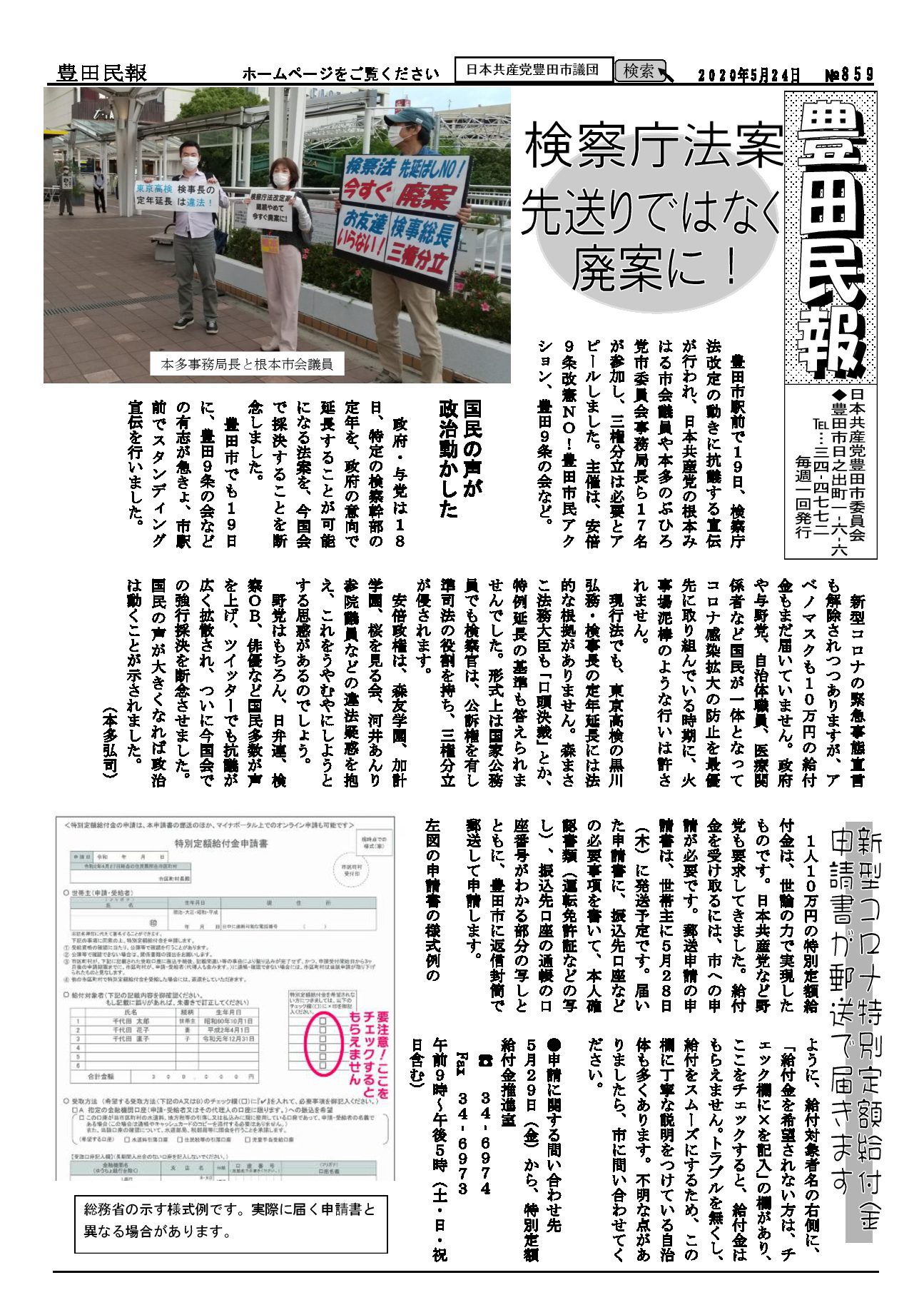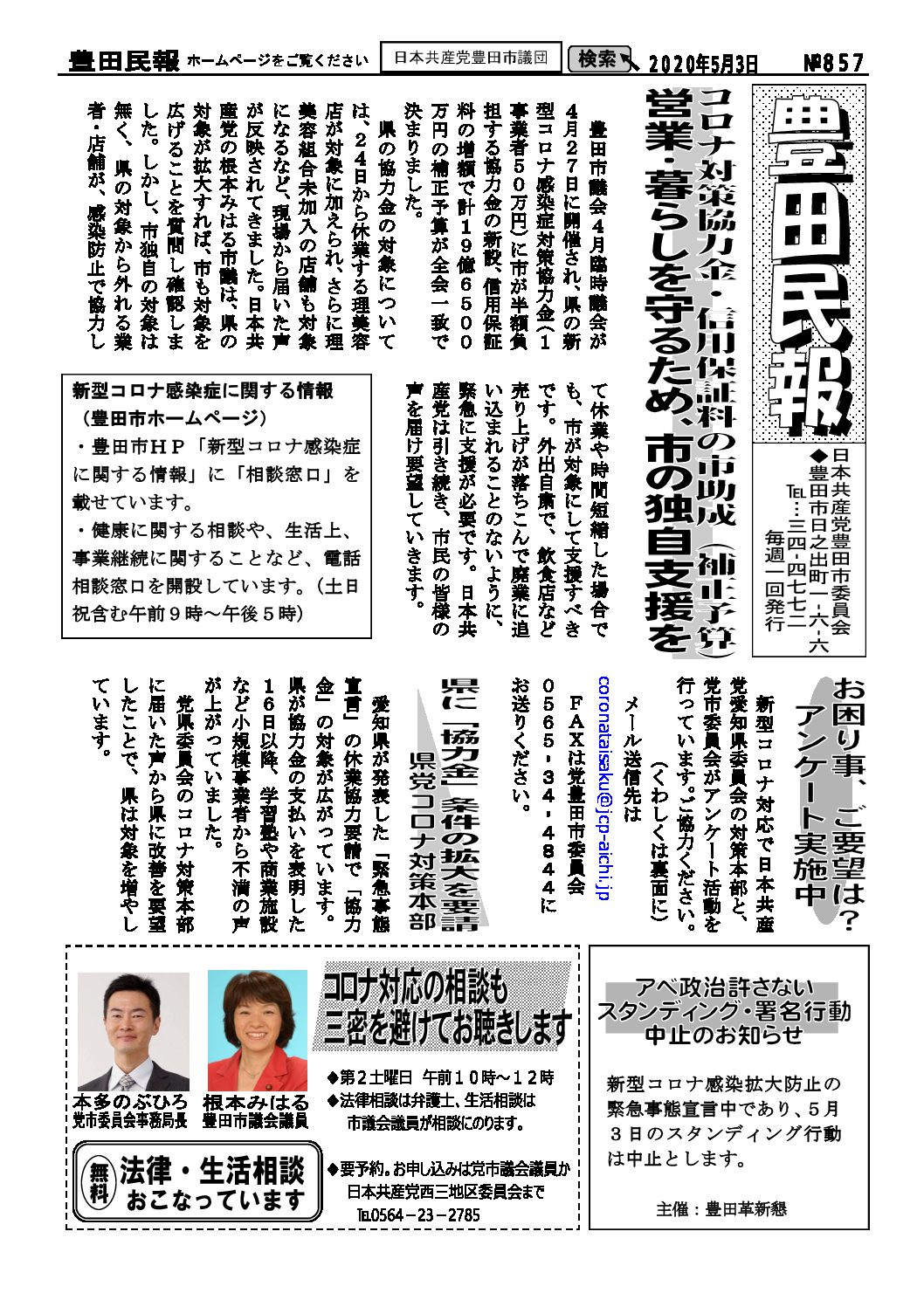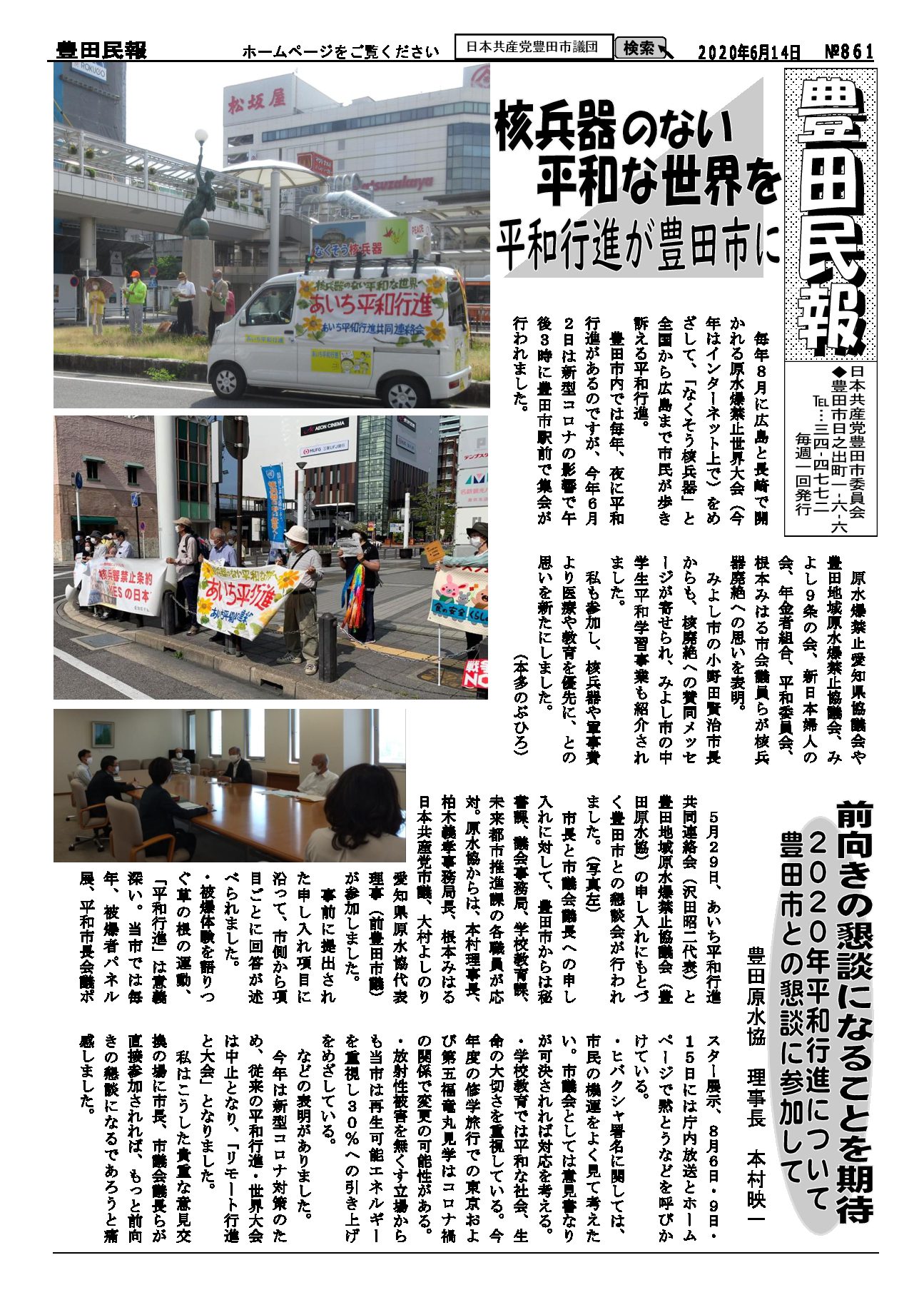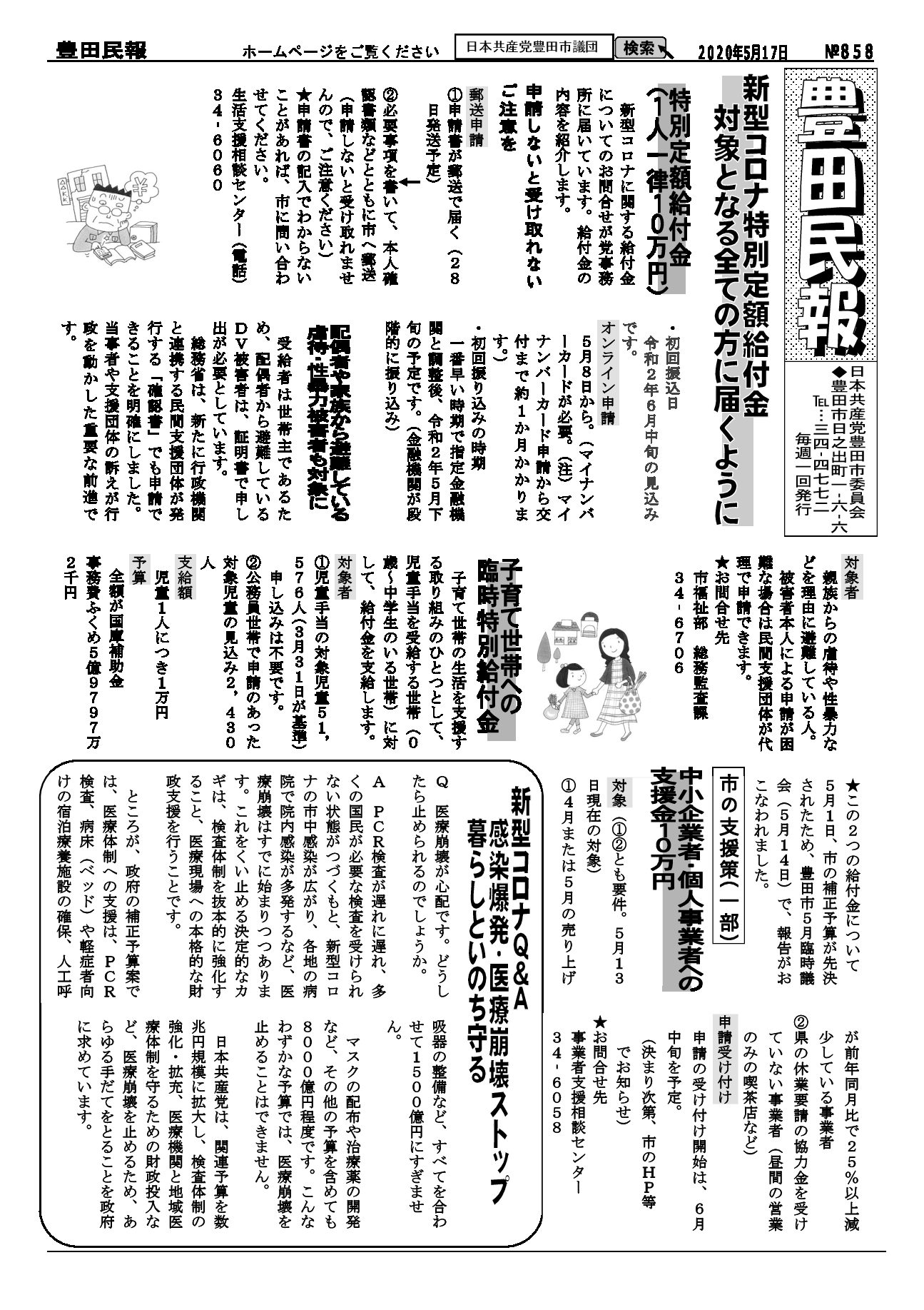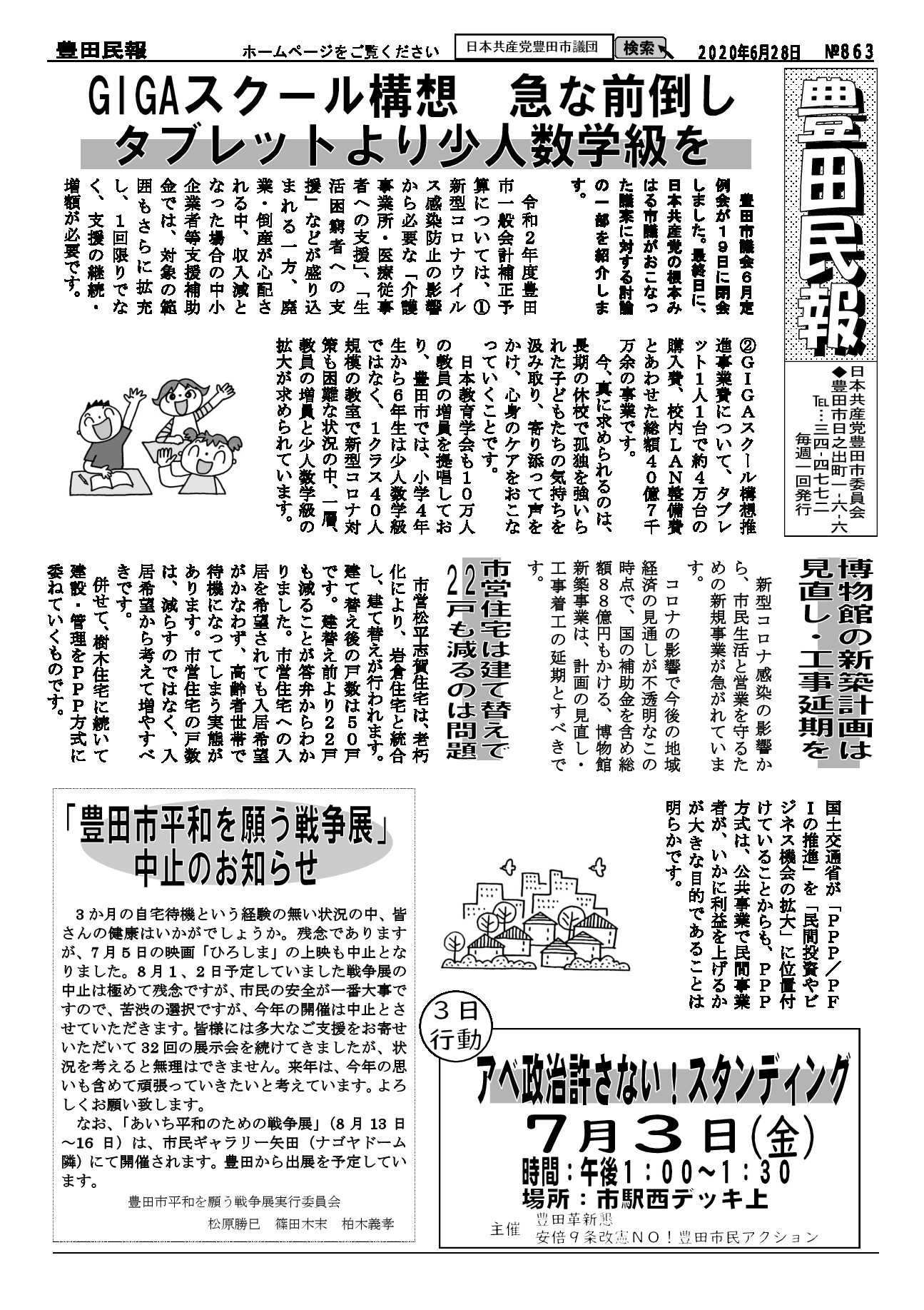 以下をクリックするとファイルが絞り込まれます すべてのカテゴリ 豊田民報 豊田民報号外など 豊田民報 2020.08.03 2020.08.02豊田民報No.866 ダウンロード 2020年8月2日発行。矢作川 鵜の首狭窄部の対策:もとむら伸子衆院議員と国交省調査。県営水道 値下げ要望、新型コロナ対策拡充を。南部休日救急内科診療所が開設、「南部に救急医療を」を求める声。(1MB) 豊田民報号外など 2020.07.26 豊田民報7,8月号外 ダウンロード 日本共産党・6月市議会の報告:GIGAスクール構想、急な前倒し。タブレットより小人数学級を。新型コロナウィルス感染症から市民のいのち・暮らし・営業を守るための緊急要請。(845KB) 豊田民報 2020.07.17 2020.07.19豊田民報No.865 ダウンロード 2020年7月19日発行。豊田市内の土砂災害警戒区域290か所増、対策の強化を。もとむら伸子衆院議員ら、豊田市内の大雨被害視察。新型コロナの対策で市教育部に子どもたち・教員への配慮とケアを申し入れ。(1MB) 豊田民報 2020.07.06 2020.07.05豊田民報No.864 ダウンロード 2020年7月5日発行。コロナ対策、世論と国会論戦で前進。もとむら伸子衆院議員、今国会の前進面と問題点を語る。衆院選愛知11区予定候補本多のぶひろ氏を発表。(357KB) 豊田民報 2020.06.28 2020.06.28豊田民報No.863 ダウンロード 2020年6月28日発行。GIGAスクール構想:急な前倒し、タブレットより小人数学級を。博物館の新築計画は見直し・工事延期を。市営住宅は建て替えで22戸も減るのは問題。コロナ危機:乗り越え新しい日本を、日本共産党の号外より。(799KB) 豊田民報 2020.06.21 2020.06.21豊田民報No.862 ダウンロード 2020年6月21日発行。子どもたちの学び・身心のケア・安全を。「身体的距離の確保」と矛盾する40人学級。20人程度の授業とするため教員」10万人増を提案。(2面は東海ブロックニュース6月号外:コロナ対策、みなさんの声を、国政に届けて)(1MB) 豊田民報 2020.06.12 2020.06.14豊田民報No.861 ダウンロード 2020年6月14日発行。核兵器のない世界を、平和行進が豊田市に。前向きの懇談を期待、豊田原水協理事長。アベ政治許さない3日行動、改憲よりコロナ対策を。教科書展示会、みんなで意見を。さよなら原発の金曜日行動が再開。豊田市議会6月定例会日程表(1MB) 豊田民報 2020.06.01 2020.05.31豊田民報No.860 ダウンロード 2020年5月31日発行。コロナで長期の臨時休校、家庭に負担増、就学援助世帯への給食費相当の支援を。コロナ対策で野党共闘、すべての学生に学費一律半額免除を。市議会6月定例会の一般質問中止、再考申し入れ。とよた応援寄付金、とよた応援商品券について。(854KB) 豊田民報 2020.05.25 2020.05.24豊田民報No.859 ダウンロード 2020年5月24日発行。検察庁法案先送りではなく廃案に!新型コロナ特別定額給付金申請書が郵送で届きます。5月臨時議会タブレットより小人数学級を。学校9月入学制いま実行する条件はあるか。(1003KB) 豊田民報 2020.05.16 2020.05.17豊田民報No.858 ダウンロード 2020年5月17日発行。新型コロナ特別定額給付金(1人一律10万円)ご注意:申請しないと受け取れない。子育て世代への臨時特別給付金。中小企業者・個人事業者への支援金。特別支援学校の休校中の支援。新型コロナについての相談など。(1012KB) 豊田民報号外など 2020.05.11 2020.05.06豊田民報5月臨時号 ダウンロード 2020年5月6日発行。市が新型コロナ緊急対策(第2弾)「水道料金」一部免除、給食費の無償期間延長等を発表。国は緊急事態宣言を延長するなら雇用・営業への「補償」を明確に。(570KB) 豊田民報 2020.04.30 2020.05.03豊田民報No.857 ダウンロード 2020年5月3日。コロナ対策協力金・信用保証料の市助成の補正予算が成立。日本共産党は営業・暮らしを守るため、市民の皆様の声を届け要望していきます。お困りごと・ご要望アンケートをお寄せください。(940KB) さらに表示