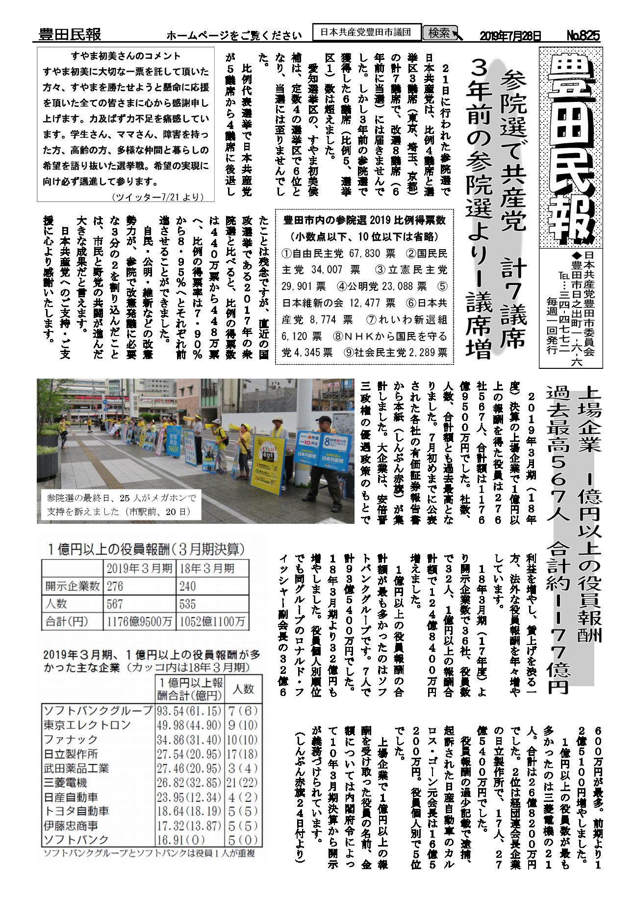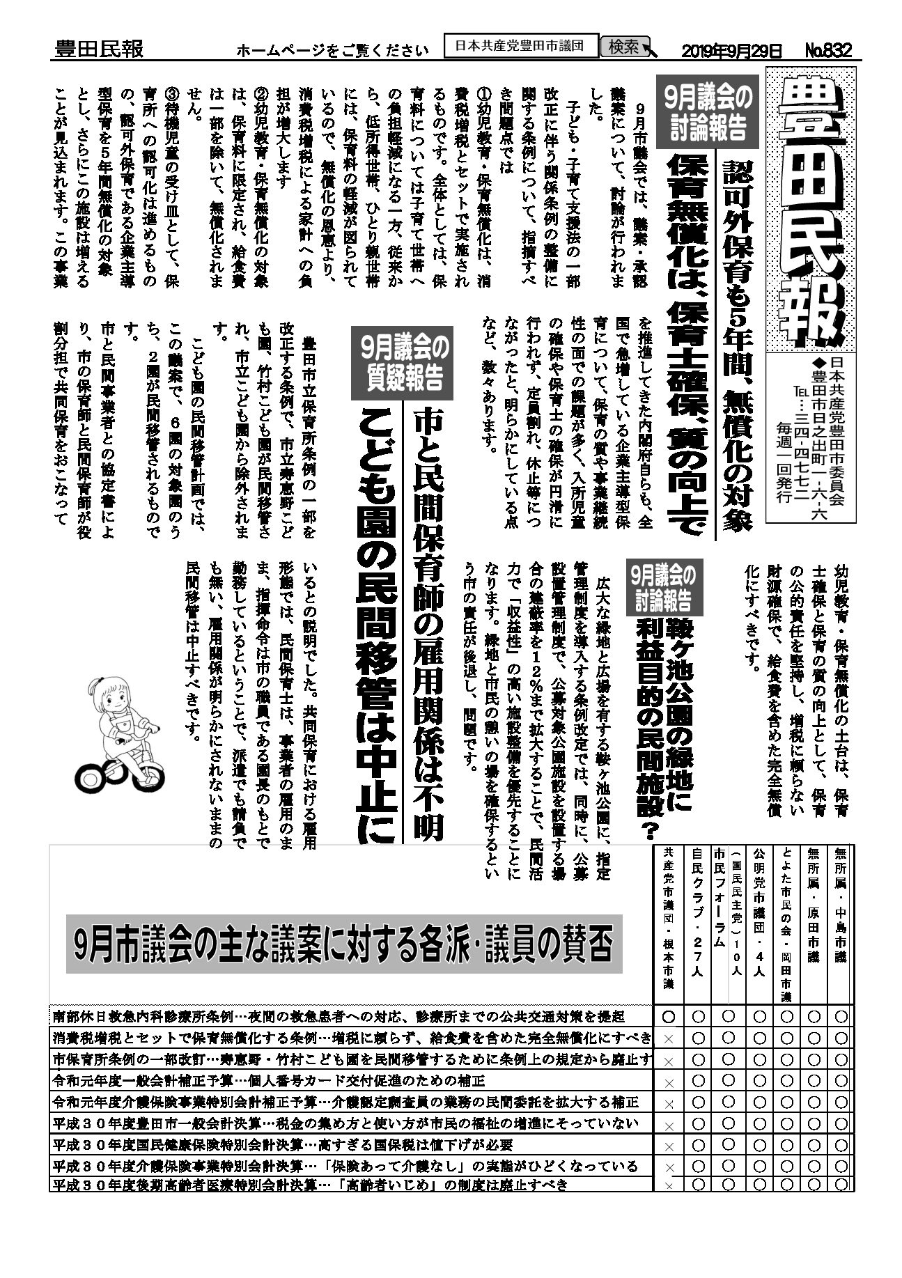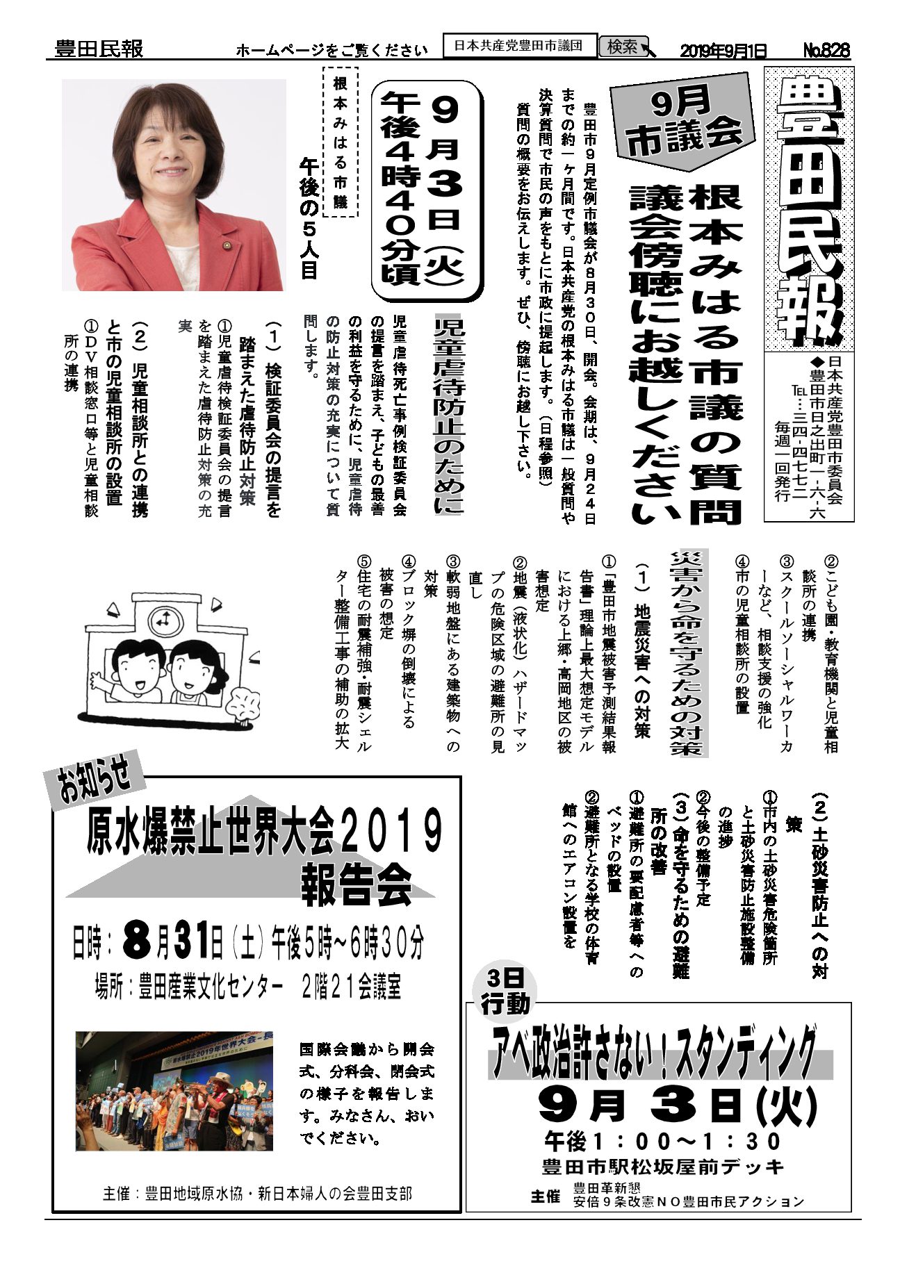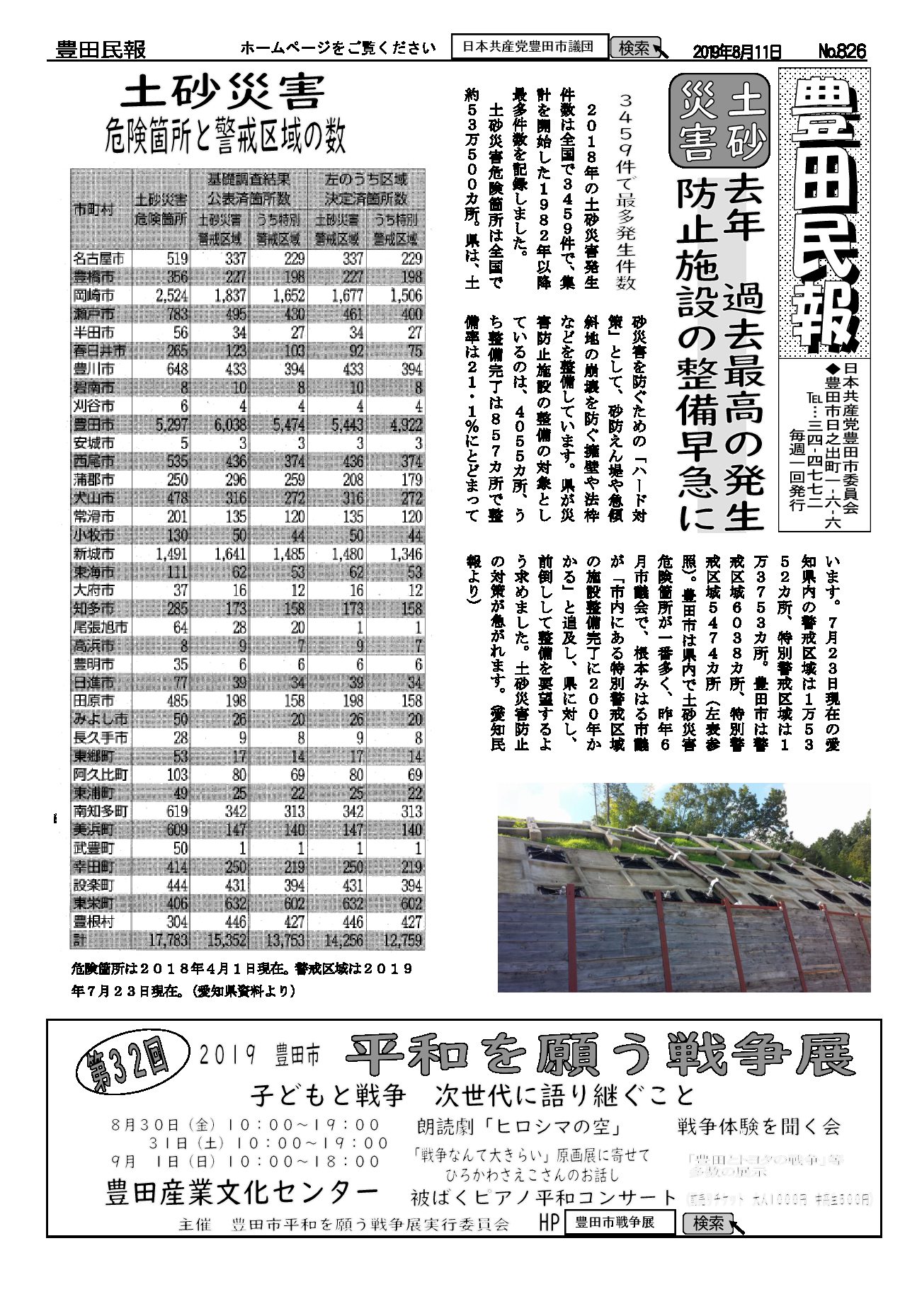 以下をクリックするとファイルが絞り込まれます すべてのカテゴリ 豊田民報 豊田民報号外など 豊田民報 2019.10.24 豊田民報No.834 ダウンロード 2019年10月13日発行。豊田市駅の東口バス停は廃止? 原発関連の交付金を豊田市は国に返納すべき。9月市議会の質疑を報告、市内の小規模事業者の約7割は赤字、市職員の長時間労働と非正規雇用の改善を(1MB) 豊田民報 2019.10.18 豊田民報No.833 ダウンロード 2019年10月6日発行。ついに安倍政権が消費税10%を強行。まずは5%に戻して景気回復を。あいちトリエンナーレの「表現の不自由展」再開求め要望書を提出(715KB) 豊田民報 2019.10.06 豊田民報No.832 ダウンロード 2019年9月29日発行。9月市議会の議案について討論。保育無償化、こども園の民間移管、鞍ヶ池公園。住みよい豊田を創る会が、予算要望書を提出。国保改善運動交流会レポ(国保料・国保税の一覧表については、一部が不正確との指摘あり)(618KB) 豊田民報 2019.10.06 豊田民報No.831 ダウンロード 2019年9月22日発行。根本みはる市議の一般質問その2、児童虐待の防止対策の充実を。平和を願う戦争展レポ。豊田市長選を考える集いレポ。図書館に関する陳情説明(774KB) 豊田民報 2019.10.06 豊田民報No.830 ダウンロード 2019年9月15日発行。10月からの消費税10%は無理! 都市計画道路の小坂若林線の整備計画状況。大清水町内の歩道が雑草多すぎて歩けない(883KB) 豊田民報 2019.09.12 豊田民報No.829 ダウンロード 2019年9月8日発行。根本みはる市議の質問報告1。災害対策、避難所見直し、避難所にベッドとエアコン設置を。豊田市国保運営協議会8/8のレポ(781KB) 豊田民報 2019.09.12 豊田民報No.828 ダウンロード 2019年9月1日発行。根本みはる市議の質問傍聴にお越しください。景気を減速させる消費税増税は中止を!(872KB) 豊田民報 2019.08.25 豊田民報No.827 ダウンロード 2019年8月25日発行。原水爆禁止世界大会2019レポ。豊田市議会9月議会の日程。行政視察レポ。こども園給食に金属混入問題で申し入れ(1MB) 豊田民報 2019.08.25 豊田民報No.826 ダウンロード 2019年8月11日発行。土砂災害、去年は過去最高の発生件数。防止施設の整備を早急に。藤岡の「無農薬農園」の造成工事、条例違反で一時中断(1MB) 豊田民報 2019.08.02 豊田民報No.825 ダウンロード 2019年7月28日発行。参院選で共産党は計7議席。上場企業は1億円以上の役員報酬、過去最高の人数と合計額。寿町、緑ヶ丘、御幸町を通る市道の歩道整備など要望(1MB) 豊田民報 2019.07.11 豊田民報No.824 ダウンロード 2019年6月23日発行。おいでんバス利用者11年連続増。小中学校でエアコン稼働。6月議会、根本市議の質問。保育無償化、子どもの安全、質の確保を。(924KB) 豊田民報 2019.06.16 豊田民報No.823 ダウンロード 2019年6月16日発行。6月議会で根本みはる市議が一般質問。救急医療・在宅医療・公共交通空白地域の対策を。運転免許証の自主返納支援制度を。豊田市子ども条例や地域保健医療計画の学習会レポ。スケボーもできる新とよパーク完成(949KB) さらに表示