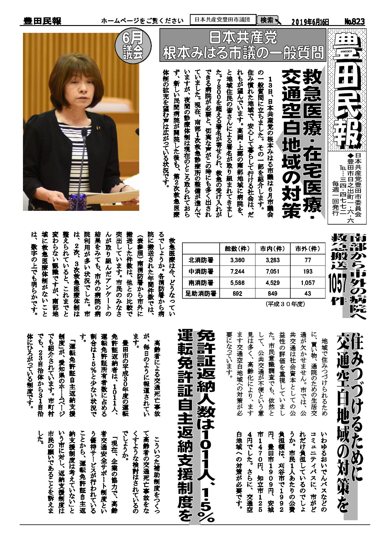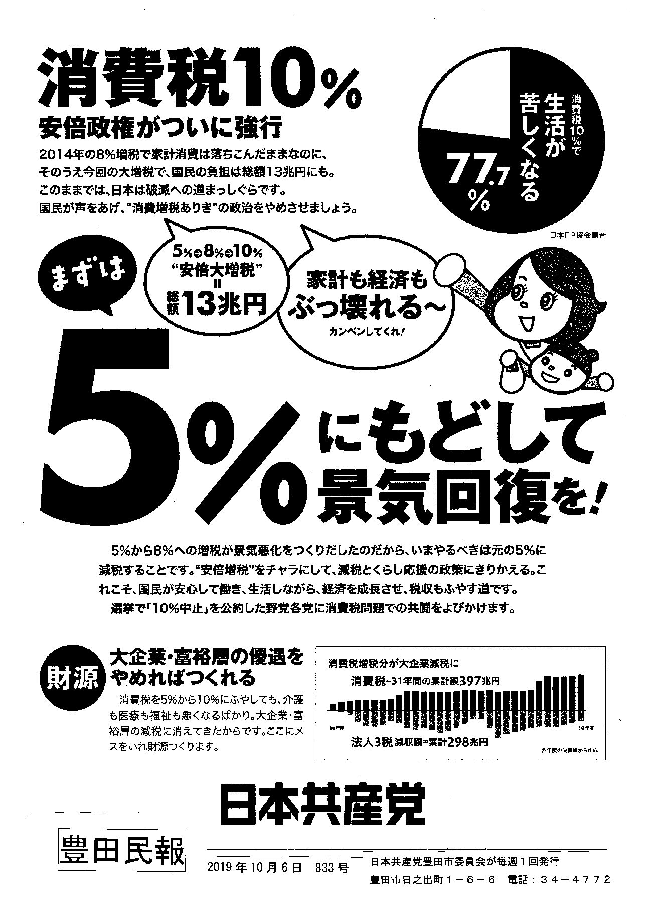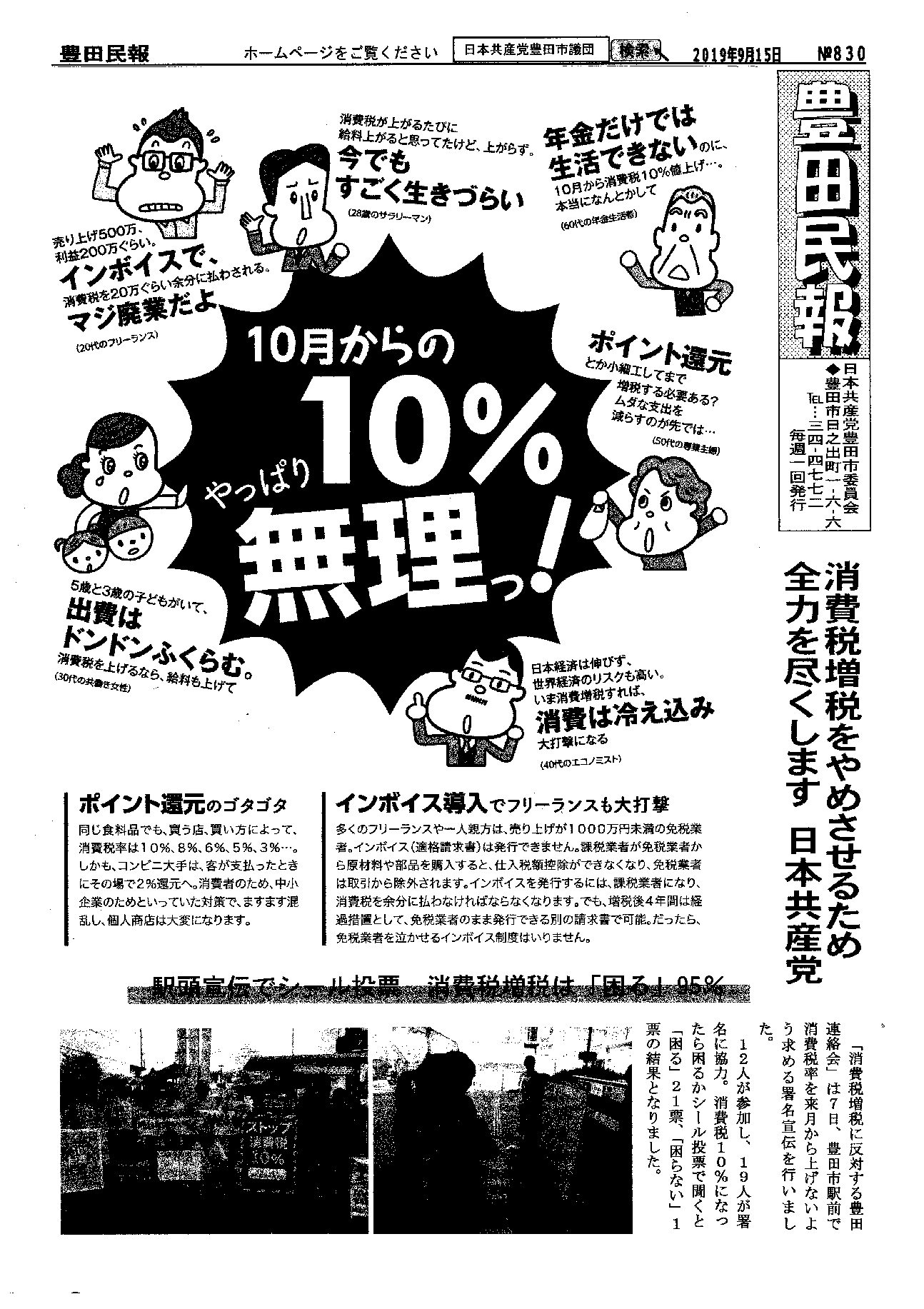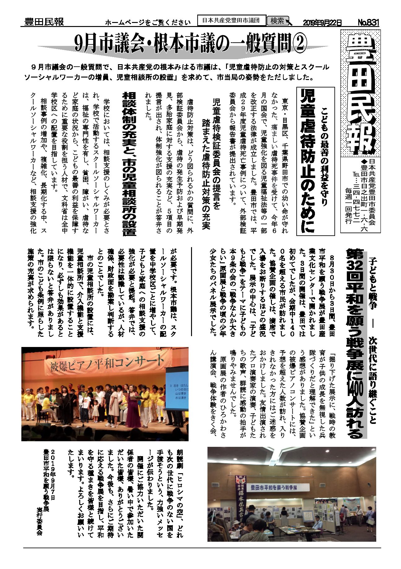 以下をクリックするとファイルが絞り込まれます すべてのカテゴリ 豊田民報 豊田民報号外など 豊田民報 2019.10.24 豊田民報No.834 ダウンロード 2019年10月13日発行。豊田市駅の東口バス停は廃止? 原発関連の交付金を豊田市は国に返納すべき。9月市議会の質疑を報告、市内の小規模事業者の約7割は赤字、市職員の長時間労働と非正規雇用の改善を(1MB) 豊田民報 2019.10.18 豊田民報No.833 ダウンロード 2019年10月6日発行。ついに安倍政権が消費税10%を強行。まずは5%に戻して景気回復を。あいちトリエンナーレの「表現の不自由展」再開求め要望書を提出(715KB) 豊田民報 2019.10.06 豊田民報No.832 ダウンロード 2019年9月29日発行。9月市議会の議案について討論。保育無償化、こども園の民間移管、鞍ヶ池公園。住みよい豊田を創る会が、予算要望書を提出。国保改善運動交流会レポ(国保料・国保税の一覧表については、一部が不正確との指摘あり)(618KB) 豊田民報 2019.10.06 豊田民報No.831 ダウンロード 2019年9月22日発行。根本みはる市議の一般質問その2、児童虐待の防止対策の充実を。平和を願う戦争展レポ。豊田市長選を考える集いレポ。図書館に関する陳情説明(774KB) 豊田民報 2019.10.06 豊田民報No.830 ダウンロード 2019年9月15日発行。10月からの消費税10%は無理! 都市計画道路の小坂若林線の整備計画状況。大清水町内の歩道が雑草多すぎて歩けない(883KB) 豊田民報 2019.09.12 豊田民報No.829 ダウンロード 2019年9月8日発行。根本みはる市議の質問報告1。災害対策、避難所見直し、避難所にベッドとエアコン設置を。豊田市国保運営協議会8/8のレポ(781KB) 豊田民報 2019.09.12 豊田民報No.828 ダウンロード 2019年9月1日発行。根本みはる市議の質問傍聴にお越しください。景気を減速させる消費税増税は中止を!(872KB) 豊田民報 2019.08.25 豊田民報No.827 ダウンロード 2019年8月25日発行。原水爆禁止世界大会2019レポ。豊田市議会9月議会の日程。行政視察レポ。こども園給食に金属混入問題で申し入れ(1MB) 豊田民報 2019.08.25 豊田民報No.826 ダウンロード 2019年8月11日発行。土砂災害、去年は過去最高の発生件数。防止施設の整備を早急に。藤岡の「無農薬農園」の造成工事、条例違反で一時中断(1MB) 豊田民報 2019.08.02 豊田民報No.825 ダウンロード 2019年7月28日発行。参院選で共産党は計7議席。上場企業は1億円以上の役員報酬、過去最高の人数と合計額。寿町、緑ヶ丘、御幸町を通る市道の歩道整備など要望(1MB) 豊田民報 2019.07.11 豊田民報No.824 ダウンロード 2019年6月23日発行。おいでんバス利用者11年連続増。小中学校でエアコン稼働。6月議会、根本市議の質問。保育無償化、子どもの安全、質の確保を。(924KB) 豊田民報 2019.06.16 豊田民報No.823 ダウンロード 2019年6月16日発行。6月議会で根本みはる市議が一般質問。救急医療・在宅医療・公共交通空白地域の対策を。運転免許証の自主返納支援制度を。豊田市子ども条例や地域保健医療計画の学習会レポ。スケボーもできる新とよパーク完成(949KB) さらに表示