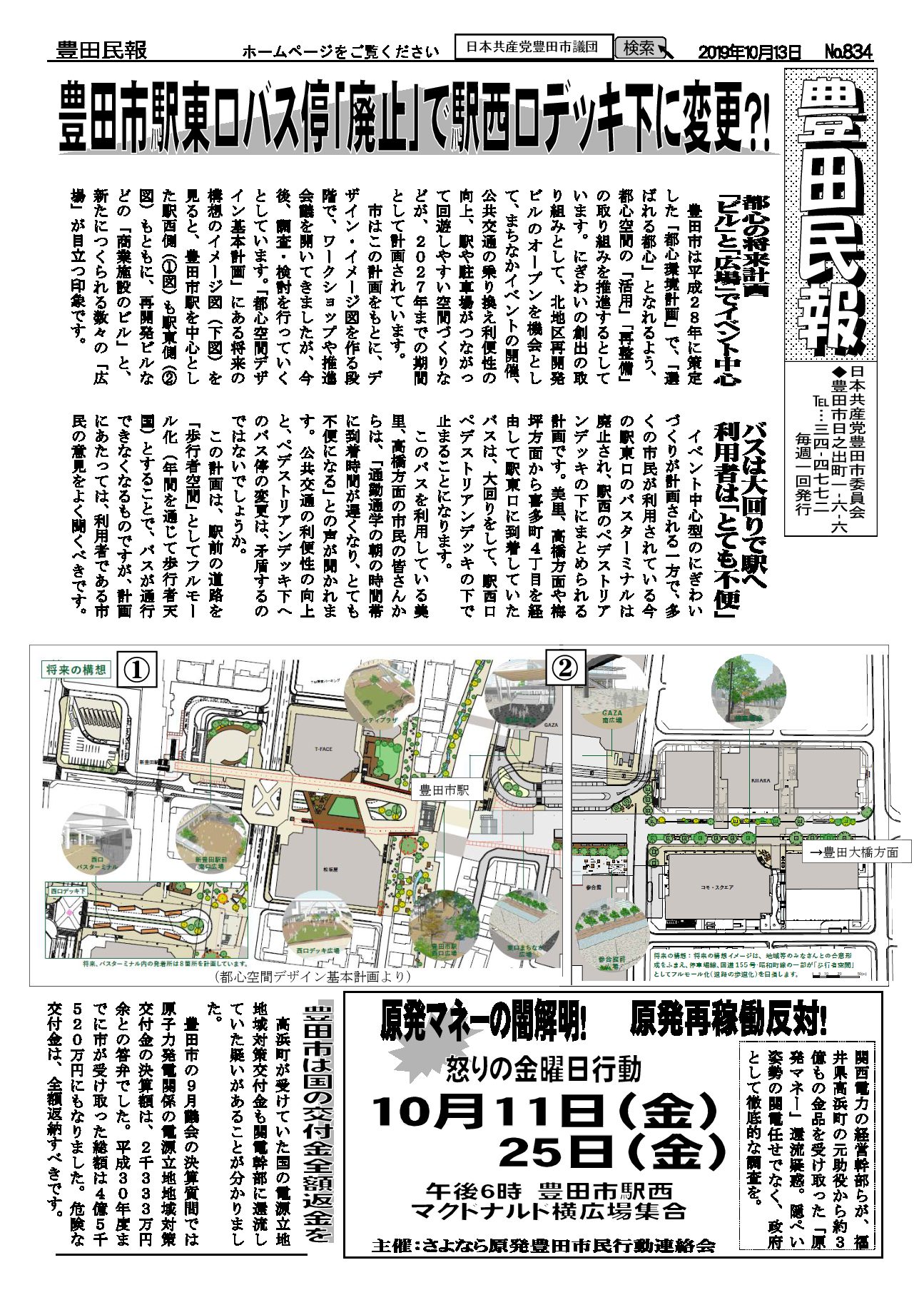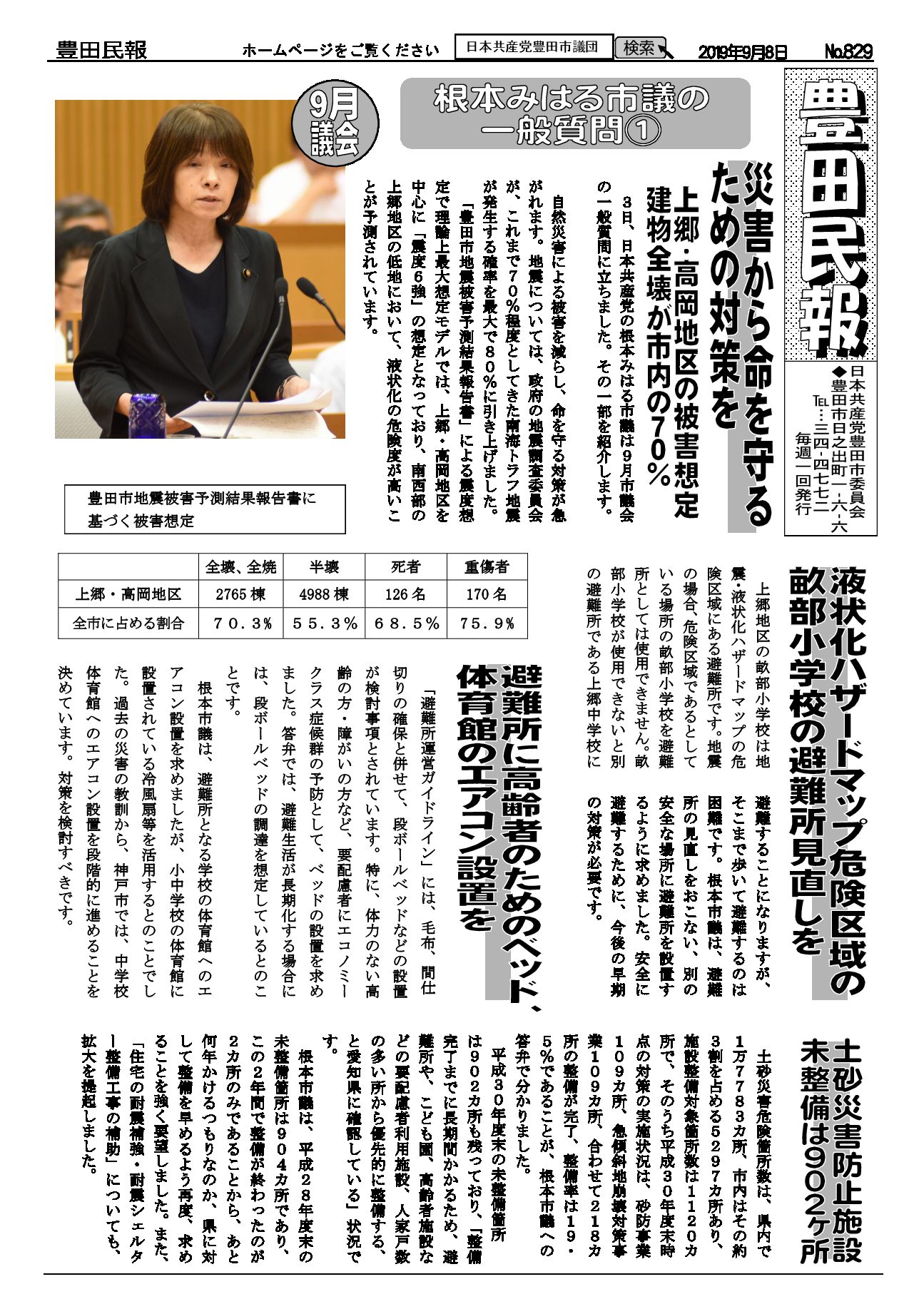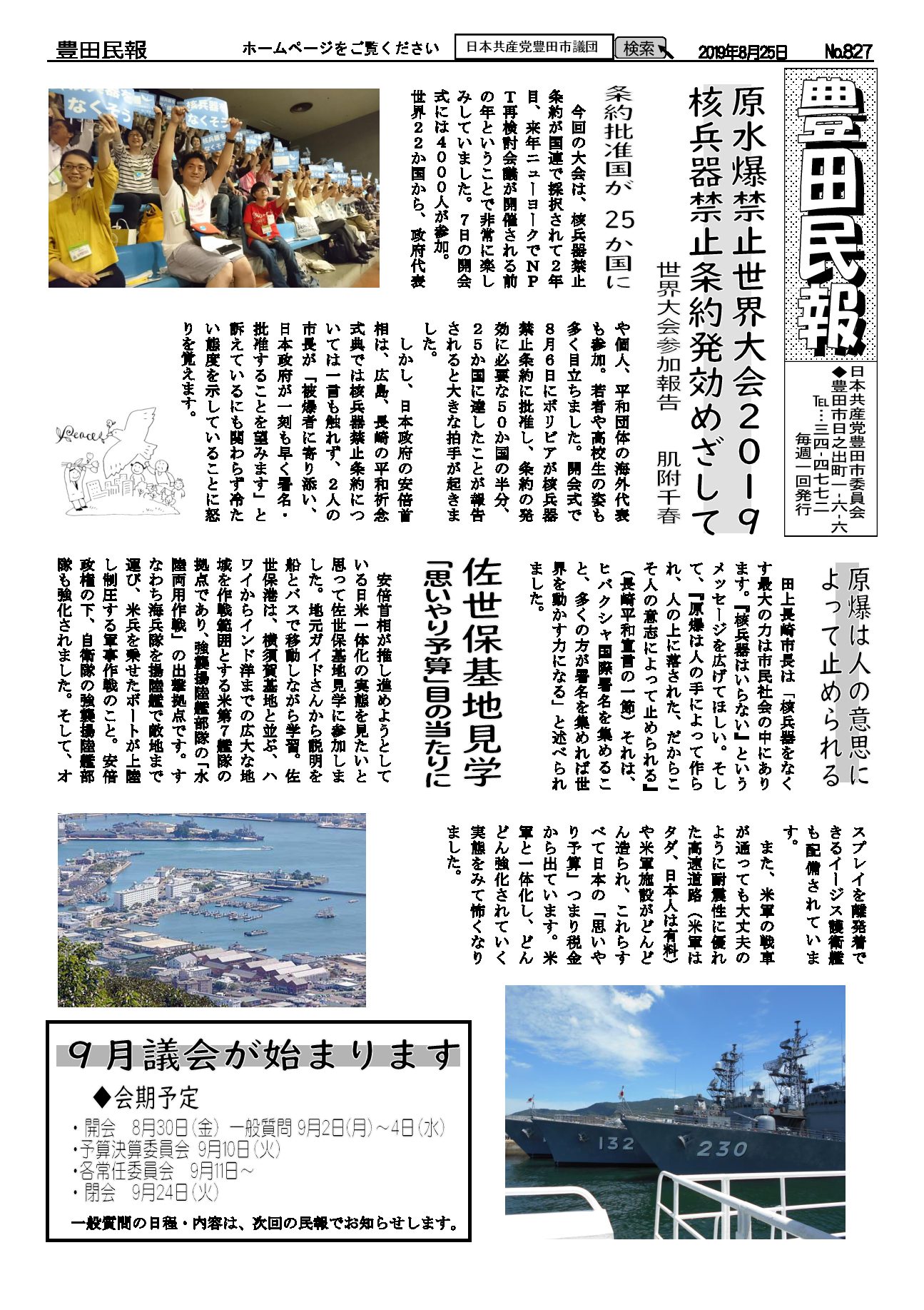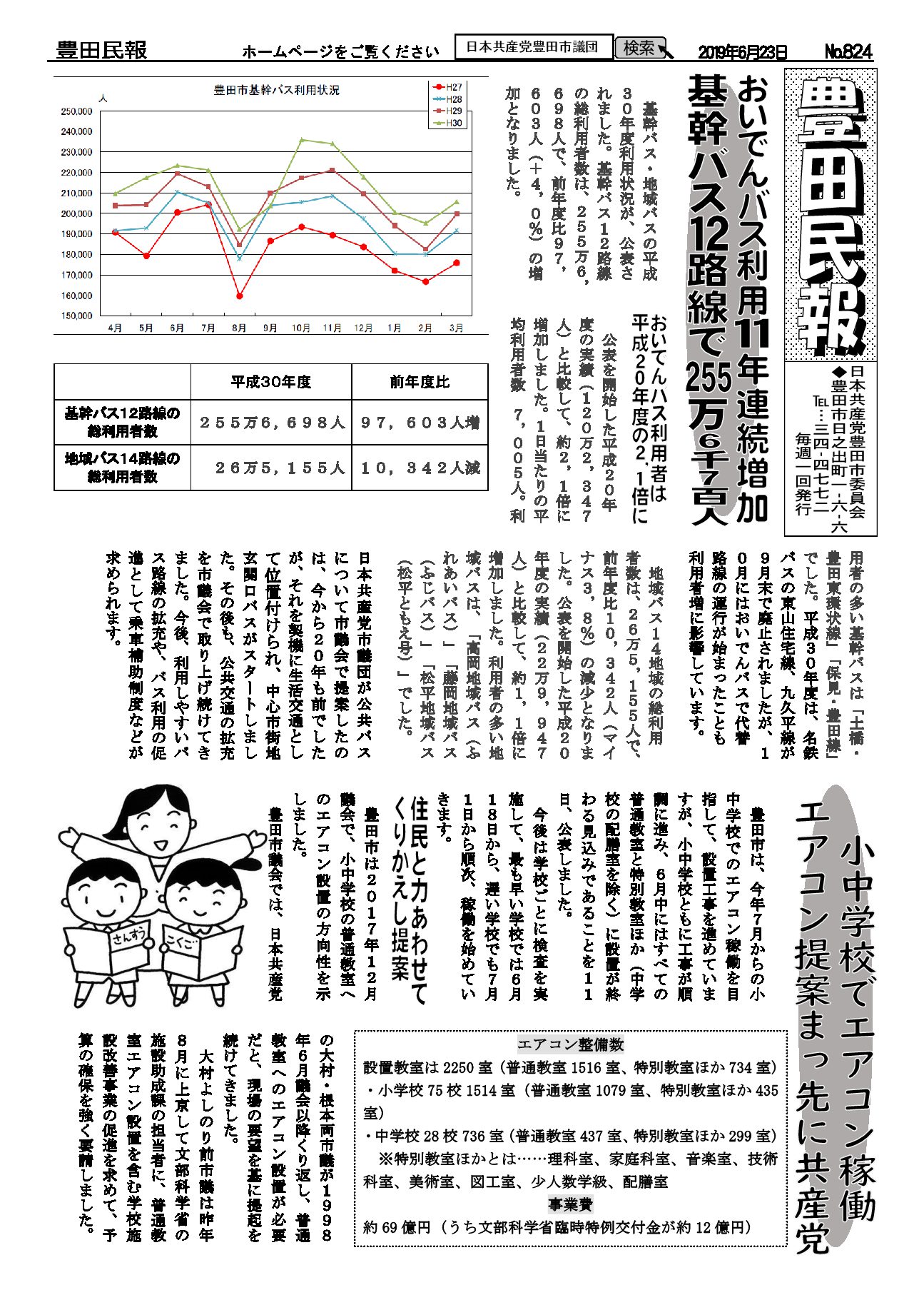 以下をクリックするとファイルが絞り込まれます すべてのカテゴリ 豊田民報 豊田民報号外など 豊田民報 2019.10.24 豊田民報No.834 ダウンロード 2019年10月13日発行。豊田市駅の東口バス停は廃止? 原発関連の交付金を豊田市は国に返納すべき。9月市議会の質疑を報告、市内の小規模事業者の約7割は赤字、市職員の長時間労働と非正規雇用の改善を(1MB) 豊田民報 2019.10.18 豊田民報No.833 ダウンロード 2019年10月6日発行。ついに安倍政権が消費税10%を強行。まずは5%に戻して景気回復を。あいちトリエンナーレの「表現の不自由展」再開求め要望書を提出(715KB) 豊田民報 2019.10.06 豊田民報No.832 ダウンロード 2019年9月29日発行。9月市議会の議案について討論。保育無償化、こども園の民間移管、鞍ヶ池公園。住みよい豊田を創る会が、予算要望書を提出。国保改善運動交流会レポ(国保料・国保税の一覧表については、一部が不正確との指摘あり)(618KB) 豊田民報 2019.10.06 豊田民報No.831 ダウンロード 2019年9月22日発行。根本みはる市議の一般質問その2、児童虐待の防止対策の充実を。平和を願う戦争展レポ。豊田市長選を考える集いレポ。図書館に関する陳情説明(774KB) 豊田民報 2019.10.06 豊田民報No.830 ダウンロード 2019年9月15日発行。10月からの消費税10%は無理! 都市計画道路の小坂若林線の整備計画状況。大清水町内の歩道が雑草多すぎて歩けない(883KB) 豊田民報 2019.09.12 豊田民報No.829 ダウンロード 2019年9月8日発行。根本みはる市議の質問報告1。災害対策、避難所見直し、避難所にベッドとエアコン設置を。豊田市国保運営協議会8/8のレポ(781KB) 豊田民報 2019.09.12 豊田民報No.828 ダウンロード 2019年9月1日発行。根本みはる市議の質問傍聴にお越しください。景気を減速させる消費税増税は中止を!(872KB) 豊田民報 2019.08.25 豊田民報No.827 ダウンロード 2019年8月25日発行。原水爆禁止世界大会2019レポ。豊田市議会9月議会の日程。行政視察レポ。こども園給食に金属混入問題で申し入れ(1MB) 豊田民報 2019.08.25 豊田民報No.826 ダウンロード 2019年8月11日発行。土砂災害、去年は過去最高の発生件数。防止施設の整備を早急に。藤岡の「無農薬農園」の造成工事、条例違反で一時中断(1MB) 豊田民報 2019.08.02 豊田民報No.825 ダウンロード 2019年7月28日発行。参院選で共産党は計7議席。上場企業は1億円以上の役員報酬、過去最高の人数と合計額。寿町、緑ヶ丘、御幸町を通る市道の歩道整備など要望(1MB) 豊田民報 2019.07.11 豊田民報No.824 ダウンロード 2019年6月23日発行。おいでんバス利用者11年連続増。小中学校でエアコン稼働。6月議会、根本市議の質問。保育無償化、子どもの安全、質の確保を。(924KB) 豊田民報 2019.06.16 豊田民報No.823 ダウンロード 2019年6月16日発行。6月議会で根本みはる市議が一般質問。救急医療・在宅医療・公共交通空白地域の対策を。運転免許証の自主返納支援制度を。豊田市子ども条例や地域保健医療計画の学習会レポ。スケボーもできる新とよパーク完成(949KB) さらに表示