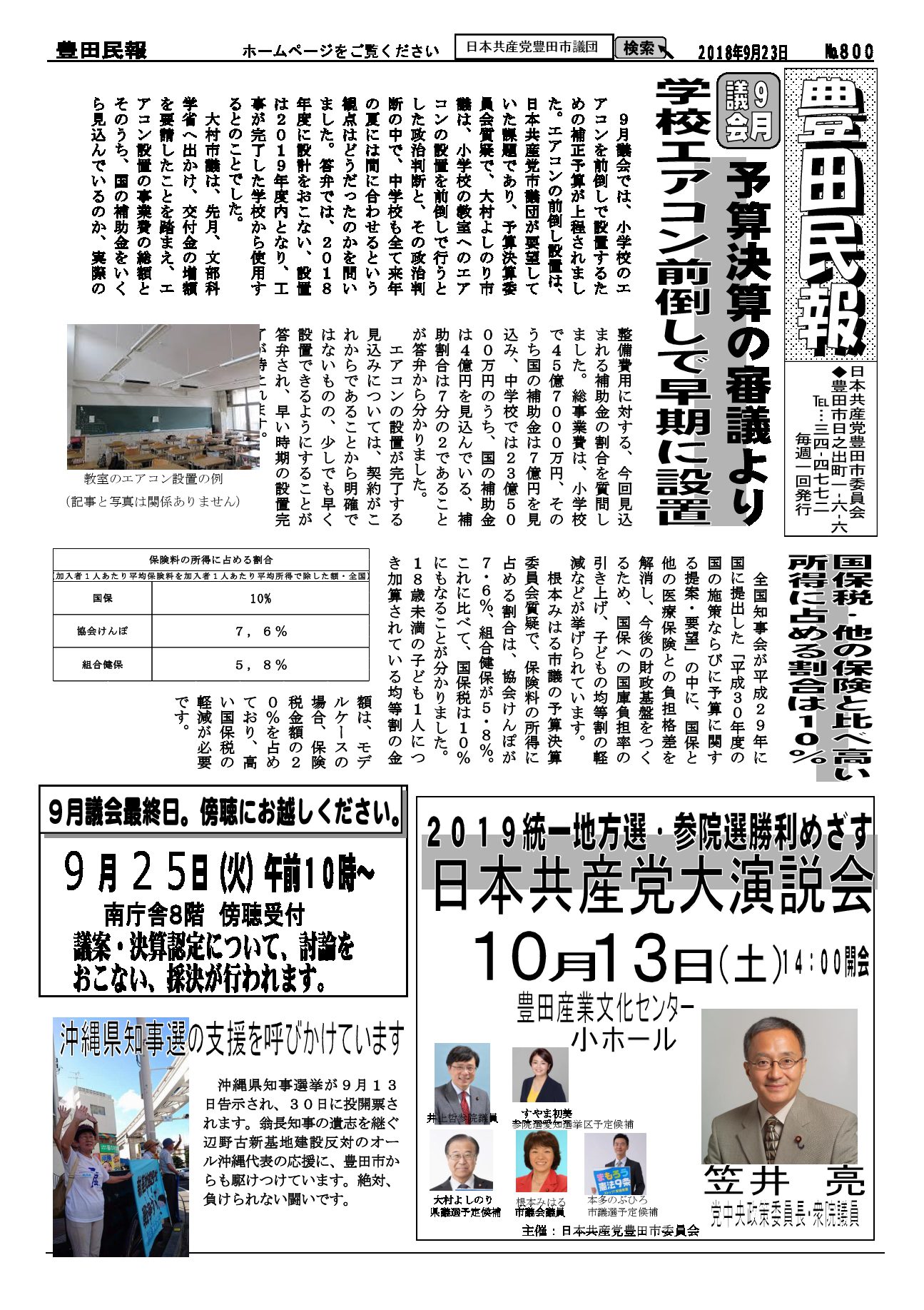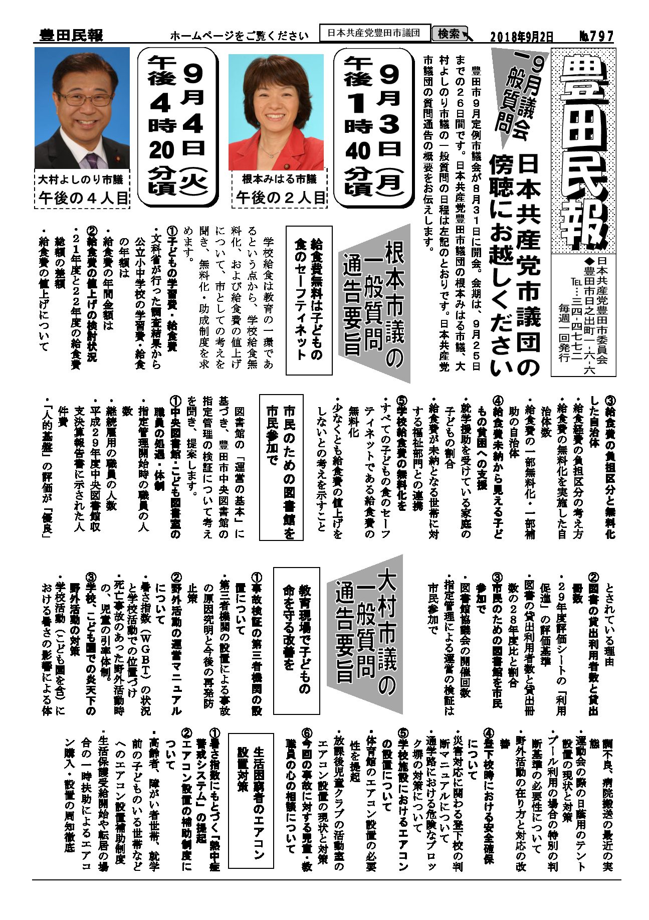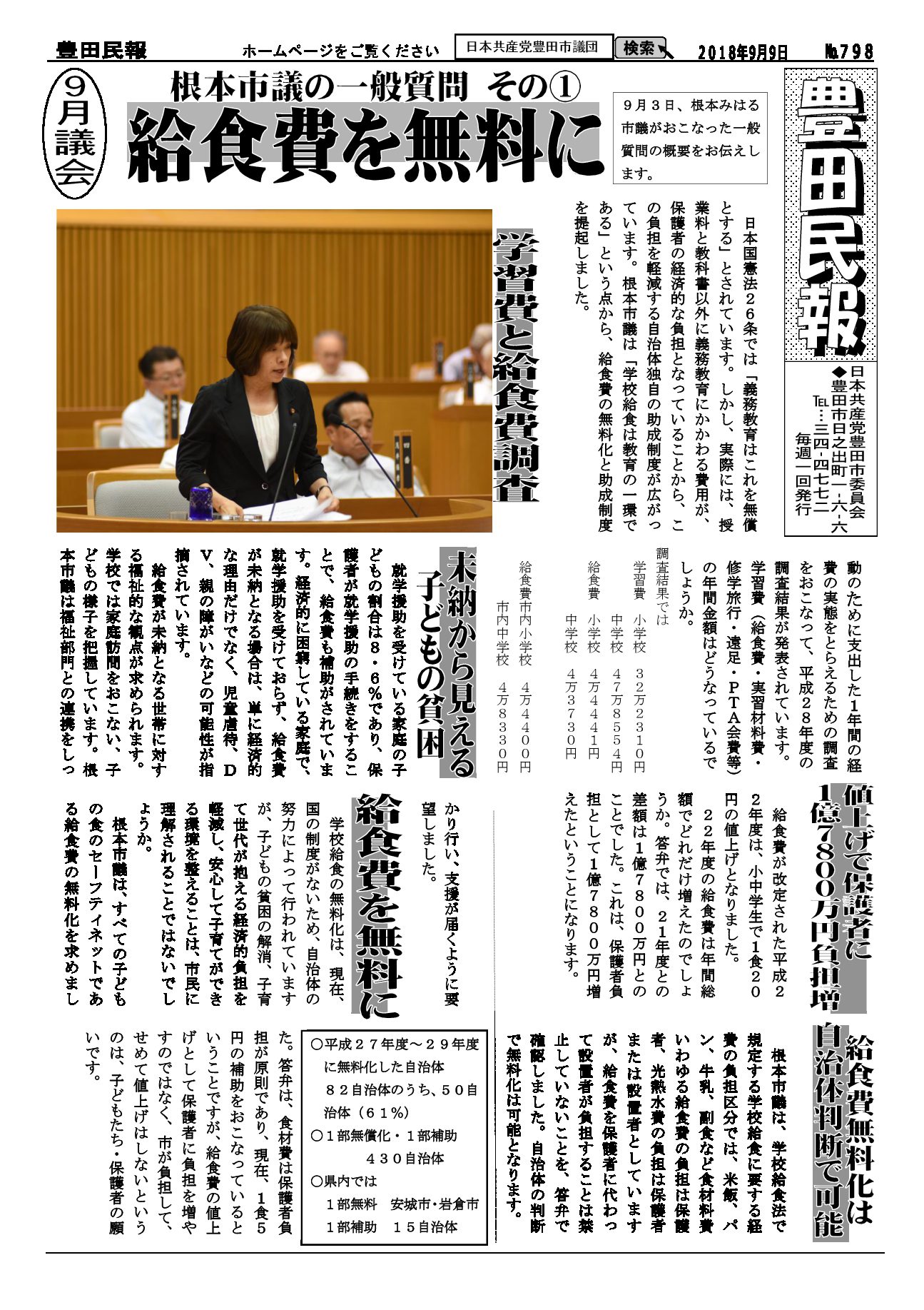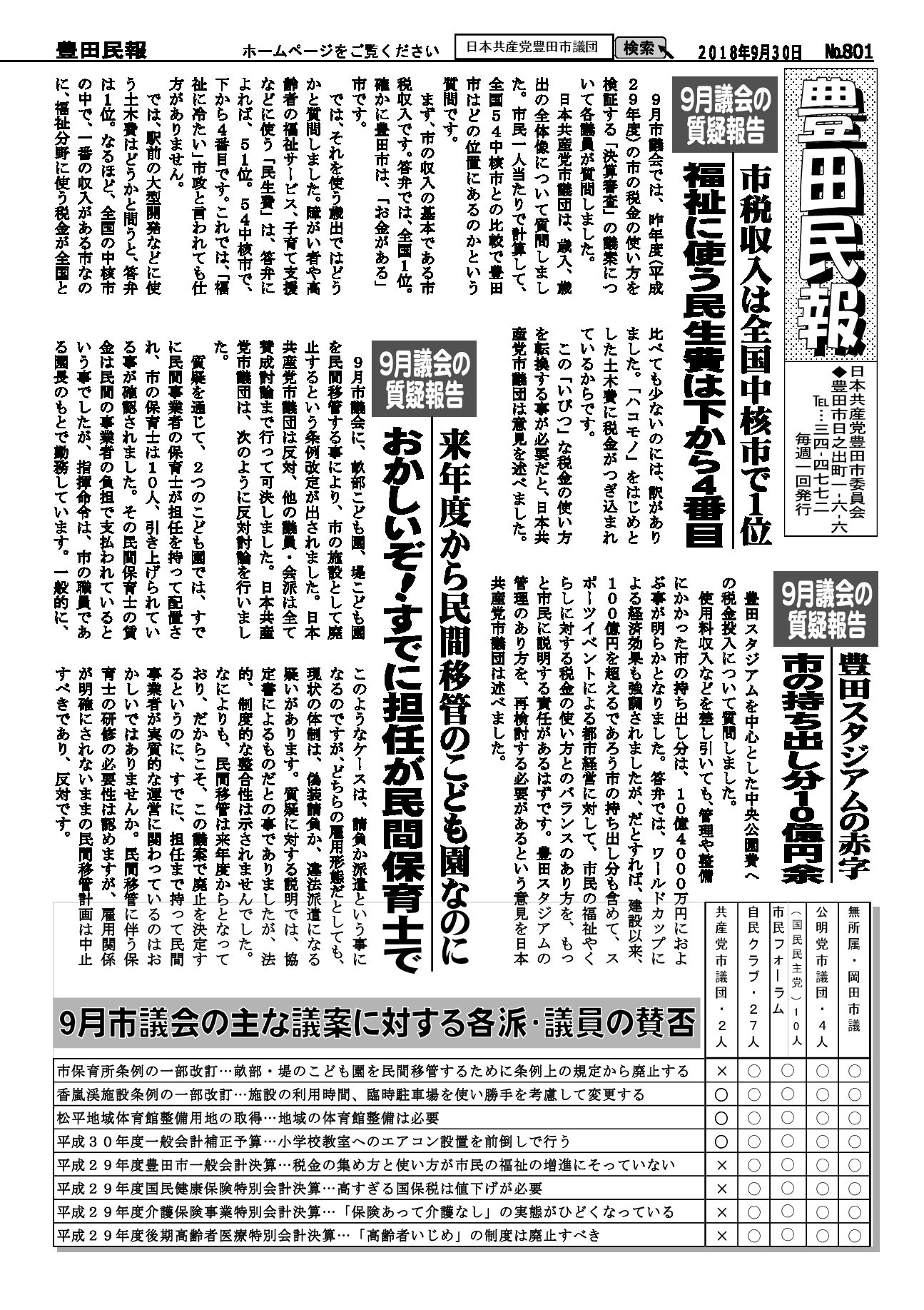 以下をクリックするとファイルが絞り込まれます すべてのカテゴリ 豊田民報 豊田民報号外など 豊田民報 2018.09.30 豊田民報No.801 ダウンロード 2018年9月30日発行。9月議会の質疑報告。市税収入は全国中核市で1位。しかし福祉に使う民生費は下から4番目。豊田スタジアムの赤字に市の持ち出し分10億円余(766KB) 豊田民報 2018.09.30 豊田民報No.800 ダウンロード 2018年9月23日発行。9月議会で豊田市の予算と決算を審議。小学校エアコンを前倒しで早期に設置。原水爆禁止世界大会の豊田市報告会(1MB) 豊田民報 2018.09.20 豊田民報No.799 ダウンロード 2018年9月16日発行。9月議会で大村市議が、教育の場で子どもの熱中症を防ぐための一般質問。根本市議は図書館運営について一般質問。(940KB) 豊田民報 2018.09.12 豊田民報No.798 ダウンロード 2018年9月9日発行。根本みはる市議の一般質問。学校給食は無料に。値上げはしないように。うら面は、沖縄県知事選と統一地方選への支援訴え(1018KB) 豊田民報 2018.08.31 豊田民報No.797 ダウンロード 2018年9月2日発行。9月市議会の一般質問、傍聴にお越しください。小学校へのエアコン設置前倒し(928KB) 豊田民報 2018.08.23 豊田民報No.796 ダウンロード 2018年8月26日発行。大村市議が文科省に要請。教室へのエアコン設置促進を(908KB) 豊田民報 2018.08.09 豊田民報No.795 ダウンロード 2018年8月5日発行。国に核兵器禁止条約への参加を働きかけて、と豊田市議会に請願書(973KB) 豊田民報 2018.07.27 豊田民報No.794 ダウンロード 2018年7月29日発行。共産党市議団が市教委に申し入れ、小中学校へのエアコン設置計画は前倒しを。市内にできた中核製材工場を視察(1MB) 豊田民報 2018.07.27 豊田民報No.793 ダウンロード 2018年7月22日発行。すやま氏と共産党市議団が、市内の土砂災害警戒区域を視察。客観性・透明性を確保した図書館評価を(1MB) 豊田民報 2018.07.13 豊田民報No.792 ダウンロード 2018年7月8日発行。日本共産党豊田・みよし市議団は7月3日~5日、行政視察を行いました。森林資源活用と学校給食無料化について(1MB) 豊田民報 2018.06.29 豊田民報No.791 ダウンロード 2018年7月1日発行。大企業の内部留保、2017年度は増加額・率とも最高。トヨタは初の20兆円超え(1MB) 豊田民報 2018.06.22 豊田民報No.790 ダウンロード 2018年6月24日発行。6月市議会で一般質問。小規模業者へ支援を。根本市議が、小規模企業振興条例の制定求める(1MB) さらに表示