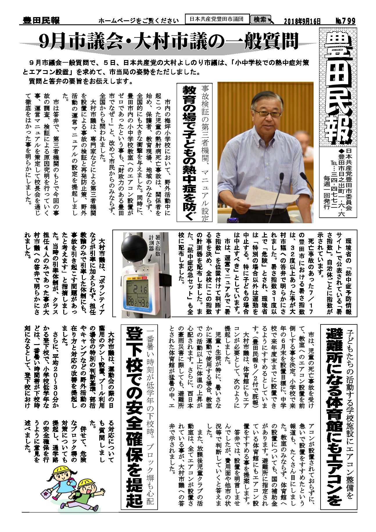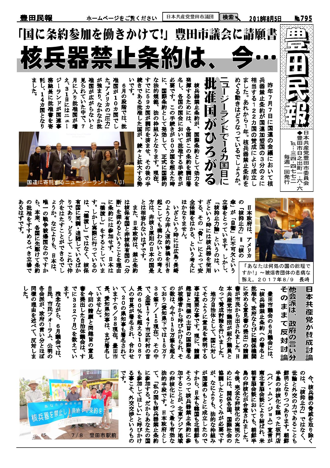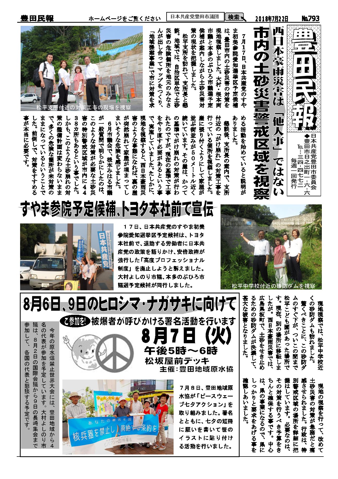 以下をクリックするとファイルが絞り込まれます すべてのカテゴリ 豊田民報 豊田民報号外など 豊田民報 2018.09.30 豊田民報No.801 ダウンロード 2018年9月30日発行。9月議会の質疑報告。市税収入は全国中核市で1位。しかし福祉に使う民生費は下から4番目。豊田スタジアムの赤字に市の持ち出し分10億円余(766KB) 豊田民報 2018.09.30 豊田民報No.800 ダウンロード 2018年9月23日発行。9月議会で豊田市の予算と決算を審議。小学校エアコンを前倒しで早期に設置。原水爆禁止世界大会の豊田市報告会(1MB) 豊田民報 2018.09.20 豊田民報No.799 ダウンロード 2018年9月16日発行。9月議会で大村市議が、教育の場で子どもの熱中症を防ぐための一般質問。根本市議は図書館運営について一般質問。(940KB) 豊田民報 2018.09.12 豊田民報No.798 ダウンロード 2018年9月9日発行。根本みはる市議の一般質問。学校給食は無料に。値上げはしないように。うら面は、沖縄県知事選と統一地方選への支援訴え(1018KB) 豊田民報 2018.08.31 豊田民報No.797 ダウンロード 2018年9月2日発行。9月市議会の一般質問、傍聴にお越しください。小学校へのエアコン設置前倒し(928KB) 豊田民報 2018.08.23 豊田民報No.796 ダウンロード 2018年8月26日発行。大村市議が文科省に要請。教室へのエアコン設置促進を(908KB) 豊田民報 2018.08.09 豊田民報No.795 ダウンロード 2018年8月5日発行。国に核兵器禁止条約への参加を働きかけて、と豊田市議会に請願書(973KB) 豊田民報 2018.07.27 豊田民報No.794 ダウンロード 2018年7月29日発行。共産党市議団が市教委に申し入れ、小中学校へのエアコン設置計画は前倒しを。市内にできた中核製材工場を視察(1MB) 豊田民報 2018.07.27 豊田民報No.793 ダウンロード 2018年7月22日発行。すやま氏と共産党市議団が、市内の土砂災害警戒区域を視察。客観性・透明性を確保した図書館評価を(1MB) 豊田民報 2018.07.13 豊田民報No.792 ダウンロード 2018年7月8日発行。日本共産党豊田・みよし市議団は7月3日~5日、行政視察を行いました。森林資源活用と学校給食無料化について(1MB) 豊田民報 2018.06.29 豊田民報No.791 ダウンロード 2018年7月1日発行。大企業の内部留保、2017年度は増加額・率とも最高。トヨタは初の20兆円超え(1MB) 豊田民報 2018.06.22 豊田民報No.790 ダウンロード 2018年6月24日発行。6月市議会で一般質問。小規模業者へ支援を。根本市議が、小規模企業振興条例の制定求める(1MB) さらに表示
