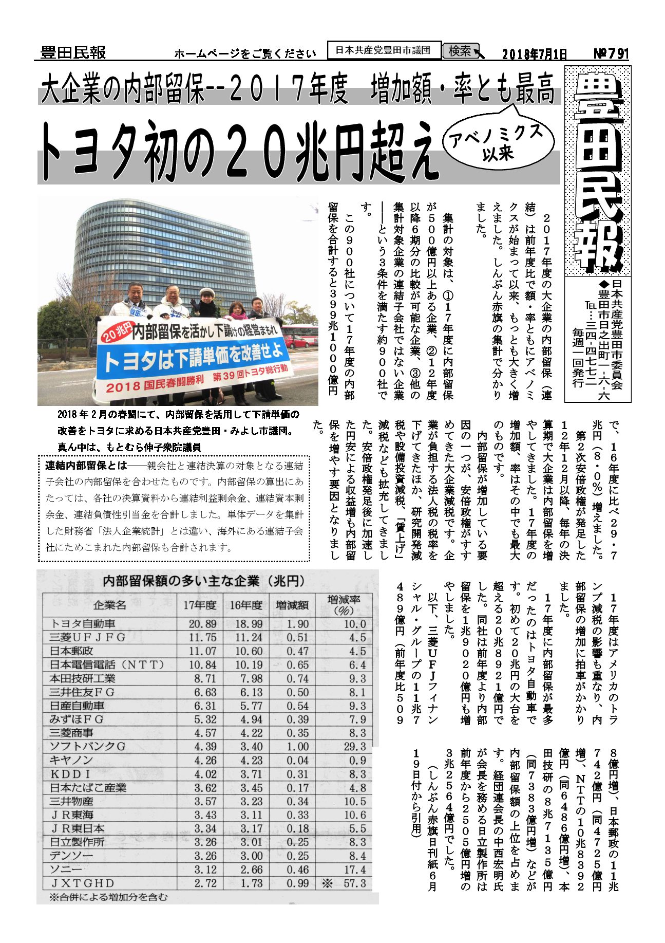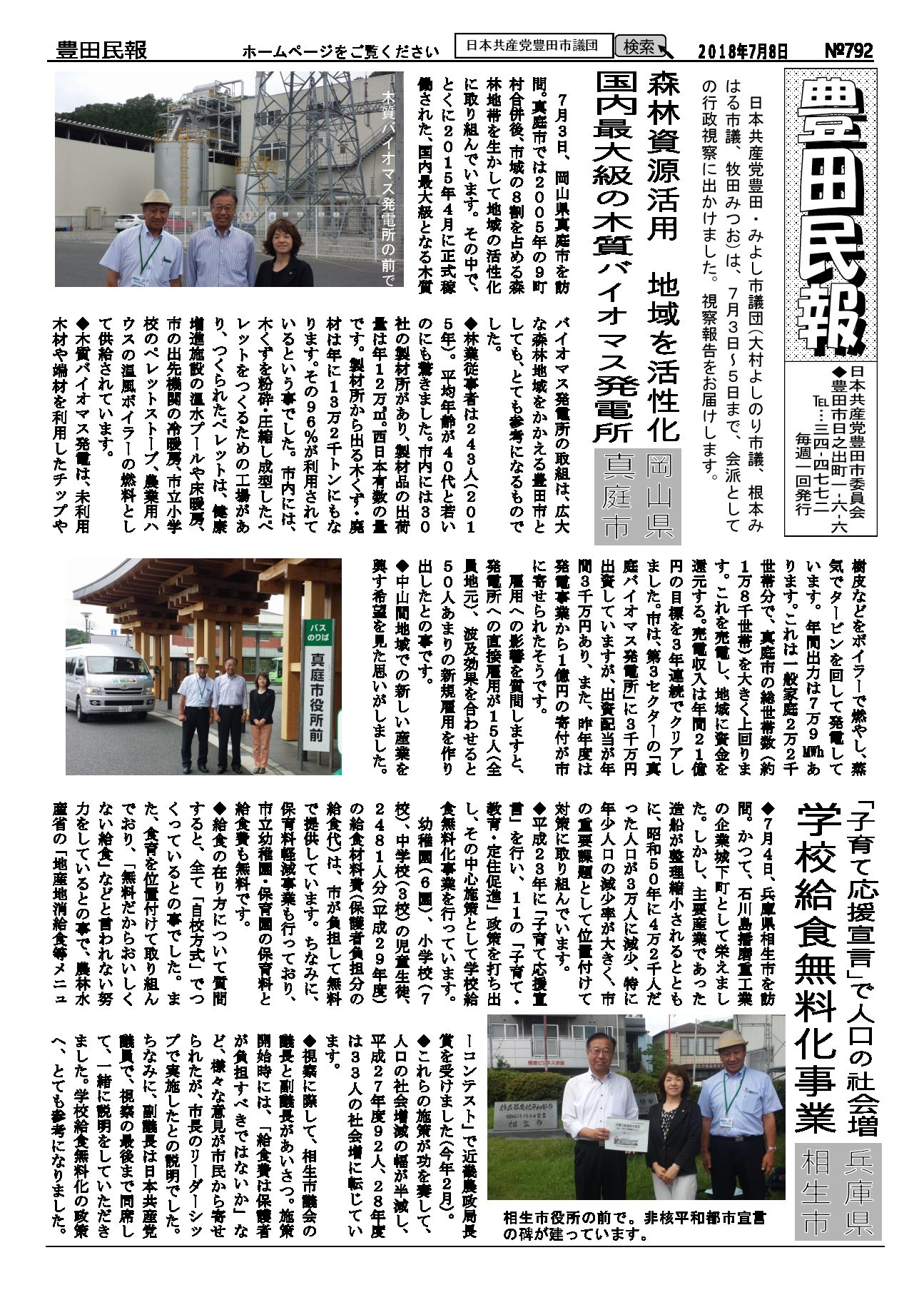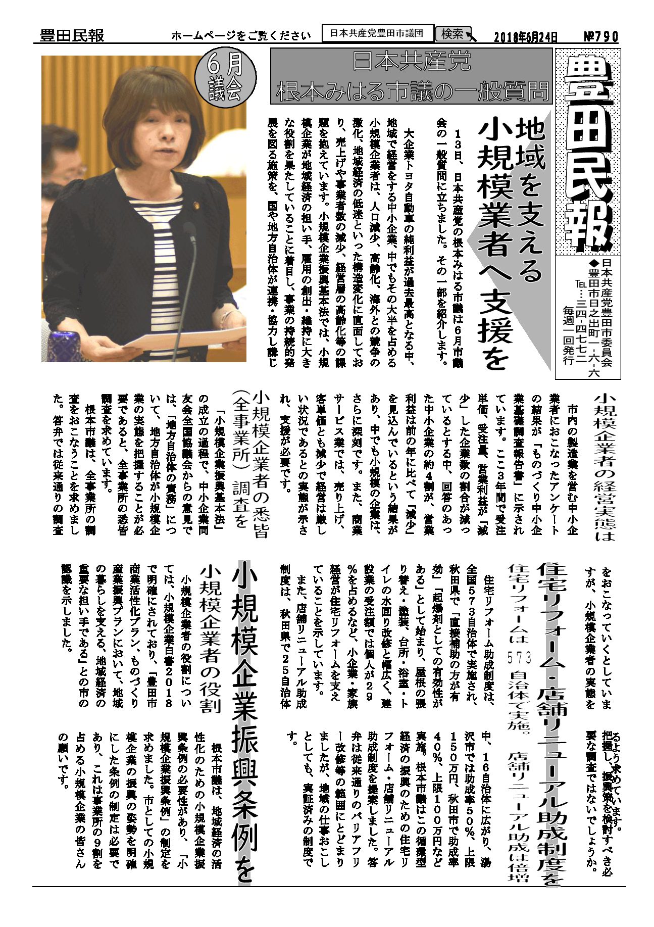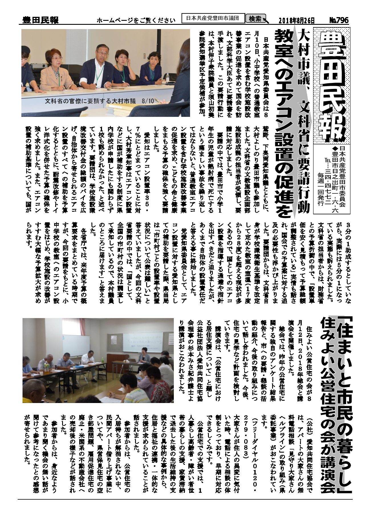 以下をクリックするとファイルが絞り込まれます すべてのカテゴリ 豊田民報 豊田民報号外など 豊田民報 2018.09.30 豊田民報No.801 ダウンロード 2018年9月30日発行。9月議会の質疑報告。市税収入は全国中核市で1位。しかし福祉に使う民生費は下から4番目。豊田スタジアムの赤字に市の持ち出し分10億円余(766KB) 豊田民報 2018.09.30 豊田民報No.800 ダウンロード 2018年9月23日発行。9月議会で豊田市の予算と決算を審議。小学校エアコンを前倒しで早期に設置。原水爆禁止世界大会の豊田市報告会(1MB) 豊田民報 2018.09.20 豊田民報No.799 ダウンロード 2018年9月16日発行。9月議会で大村市議が、教育の場で子どもの熱中症を防ぐための一般質問。根本市議は図書館運営について一般質問。(940KB) 豊田民報 2018.09.12 豊田民報No.798 ダウンロード 2018年9月9日発行。根本みはる市議の一般質問。学校給食は無料に。値上げはしないように。うら面は、沖縄県知事選と統一地方選への支援訴え(1018KB) 豊田民報 2018.08.31 豊田民報No.797 ダウンロード 2018年9月2日発行。9月市議会の一般質問、傍聴にお越しください。小学校へのエアコン設置前倒し(928KB) 豊田民報 2018.08.23 豊田民報No.796 ダウンロード 2018年8月26日発行。大村市議が文科省に要請。教室へのエアコン設置促進を(908KB) 豊田民報 2018.08.09 豊田民報No.795 ダウンロード 2018年8月5日発行。国に核兵器禁止条約への参加を働きかけて、と豊田市議会に請願書(973KB) 豊田民報 2018.07.27 豊田民報No.794 ダウンロード 2018年7月29日発行。共産党市議団が市教委に申し入れ、小中学校へのエアコン設置計画は前倒しを。市内にできた中核製材工場を視察(1MB) 豊田民報 2018.07.27 豊田民報No.793 ダウンロード 2018年7月22日発行。すやま氏と共産党市議団が、市内の土砂災害警戒区域を視察。客観性・透明性を確保した図書館評価を(1MB) 豊田民報 2018.07.13 豊田民報No.792 ダウンロード 2018年7月8日発行。日本共産党豊田・みよし市議団は7月3日~5日、行政視察を行いました。森林資源活用と学校給食無料化について(1MB) 豊田民報 2018.06.29 豊田民報No.791 ダウンロード 2018年7月1日発行。大企業の内部留保、2017年度は増加額・率とも最高。トヨタは初の20兆円超え(1MB) 豊田民報 2018.06.22 豊田民報No.790 ダウンロード 2018年6月24日発行。6月市議会で一般質問。小規模業者へ支援を。根本市議が、小規模企業振興条例の制定求める(1MB) さらに表示