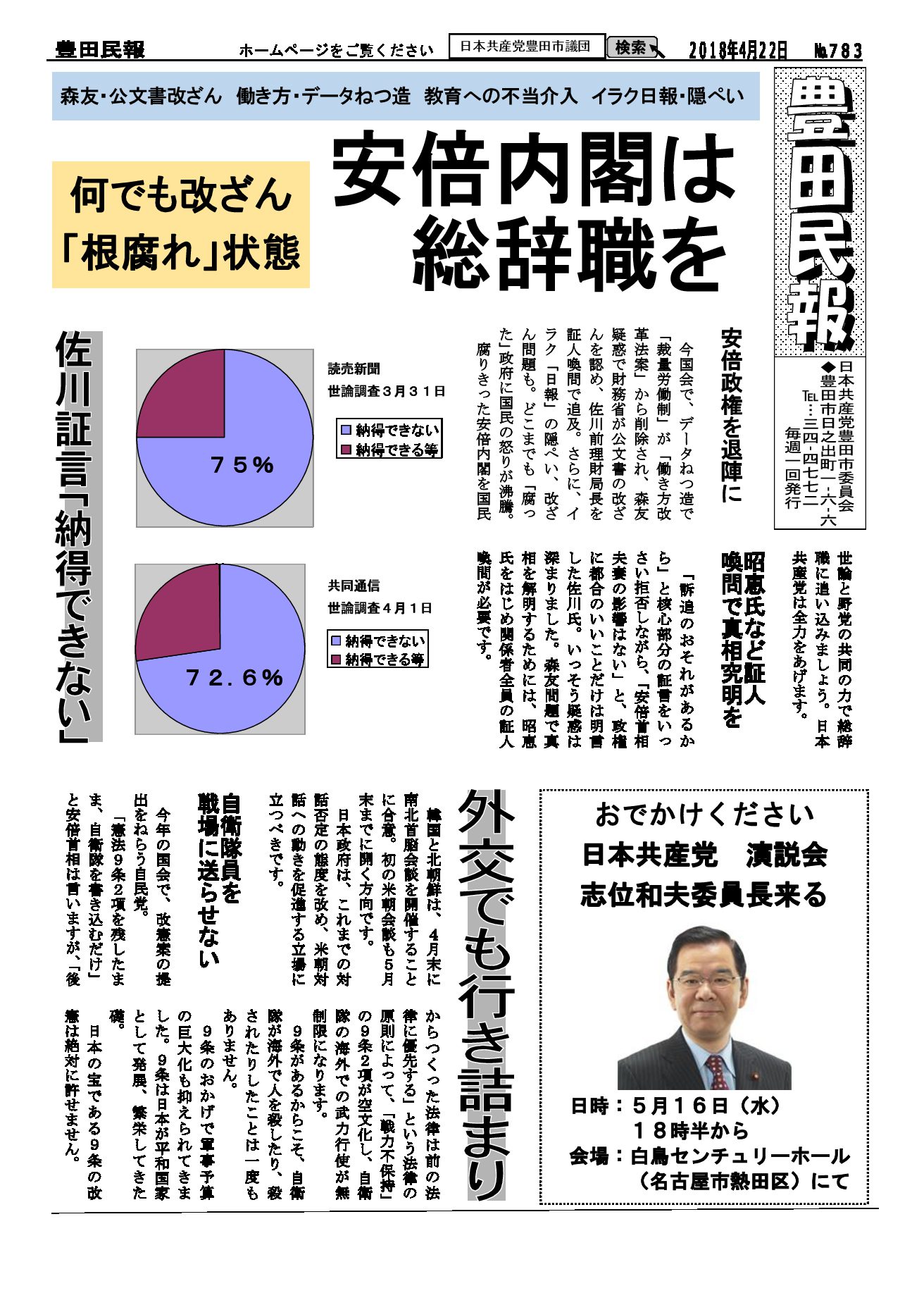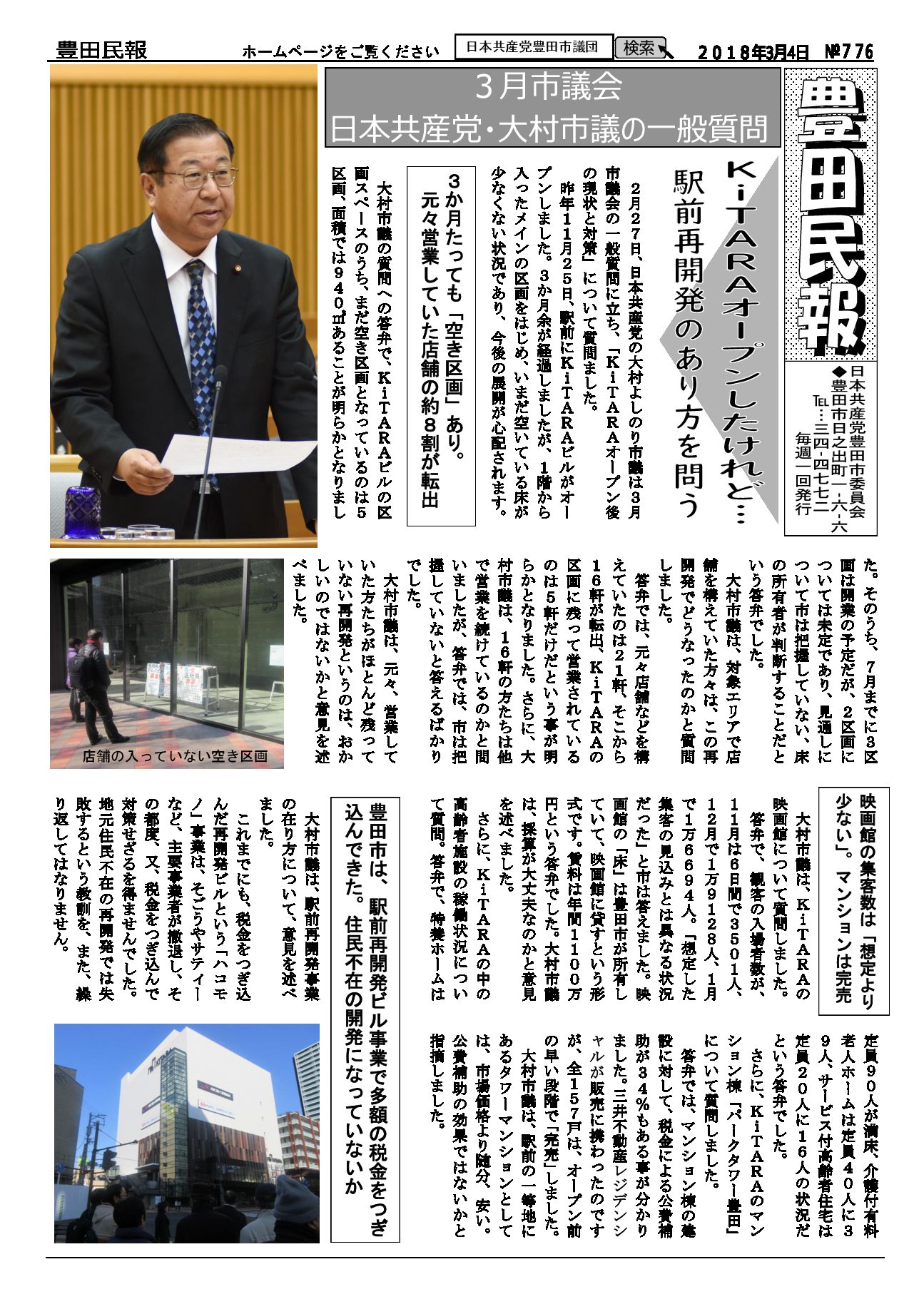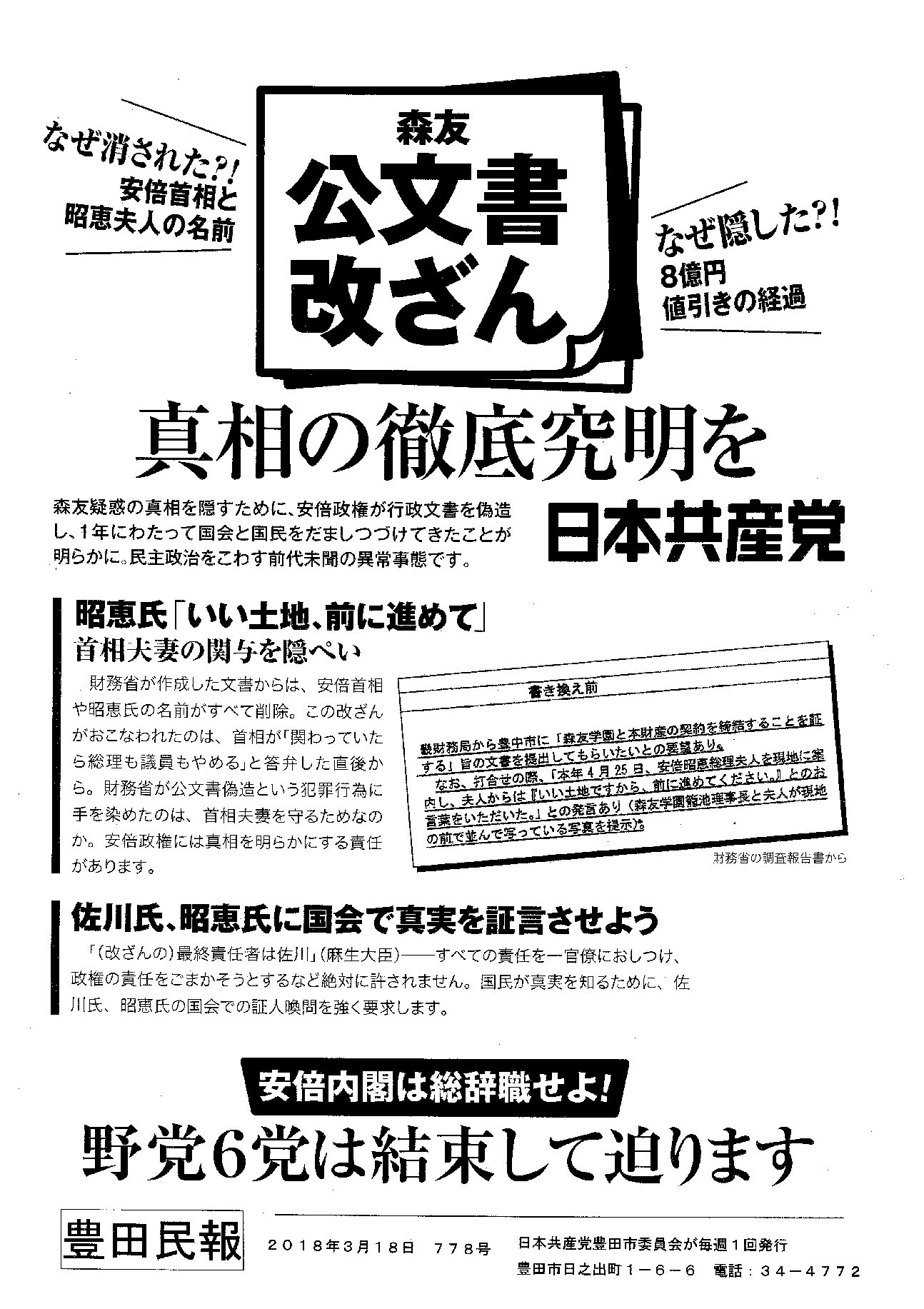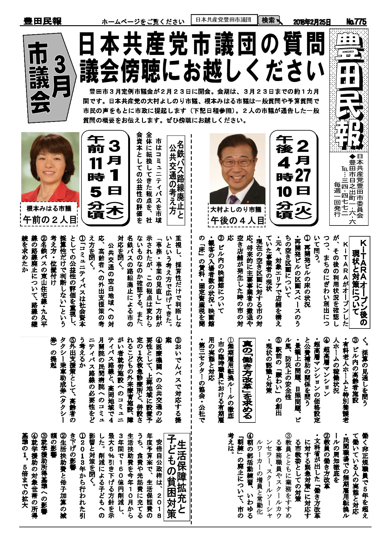 以下をクリックするとファイルが絞り込まれます すべてのカテゴリ 豊田民報 豊田民報号外など 豊田民報 2018.04.27 豊田民報No.783 ダウンロード 2018年4月22日発行。公文書改ざんやデータねつ造など「根腐れ」状態。安倍内閣は総辞職を(733KB) 豊田民報 2018.04.14 豊田民報No.782 ダウンロード 2018年4月15日発行。就学援助の入学準備金が前倒しに。被災者支援の制度、県と市で要望が実る(1MB) 豊田民報 2018.04.05 豊田民報No.781 ダウンロード 2018年4月8日発行。豊田市南部地域に総合病院が開院(799KB) 豊田民報 2018.03.29 豊田民報No.780 ダウンロード 2018年4月1日発行。自民党の池田衆院議員が文科省に圧力(601KB) 豊田民報 2018.03.25 豊田民報No.779 ダウンロード 2018年3月25日発行。市の新年度予算について日本共産党市議団の意見(905KB) 豊田民報 2018.03.19 豊田民報No.778 ダウンロード 2018年3月18日発行。森友学園に関する公文書の改ざんが明らかに。真相の徹底究明を(611KB) 豊田民報 2018.03.10 豊田民報No.777 ダウンロード 2018年3月11日発行。3月議会で根本市議が名鉄バス路線廃止について一般質問(862KB) 豊田民報 2018.03.10 豊田民報No.776 ダウンロード 2018年3月4日発行。3月議会で大村市議が駅前再開発について一般質問(1MB) 豊田民報 2018.02.22 豊田民報No.775 ダウンロード 2018年2月25日発行。3月議会の日程案内。議会傍聴にお越しください(1MB) 豊田民報 2018.02.17 豊田民報No.774 ダウンロード 2018年2月18日発行。トヨタ本社前デモ600人、無期転換ルール説明、すやまさん市駅前宣伝の報告など(1MB) 豊田民報 2018.02.08 豊田民報No.773 ダウンロード 2018年2月11日発行。名鉄バス路線の継続を要請など(1MB) 豊田民報 2018.02.04 豊田民報No.772 ダウンロード 2018年2月4日発行。STOPアベノミクス、経済にもデモクラシーを。在宅医療・介護をどうするか、問われる市の対応(881KB) さらに表示