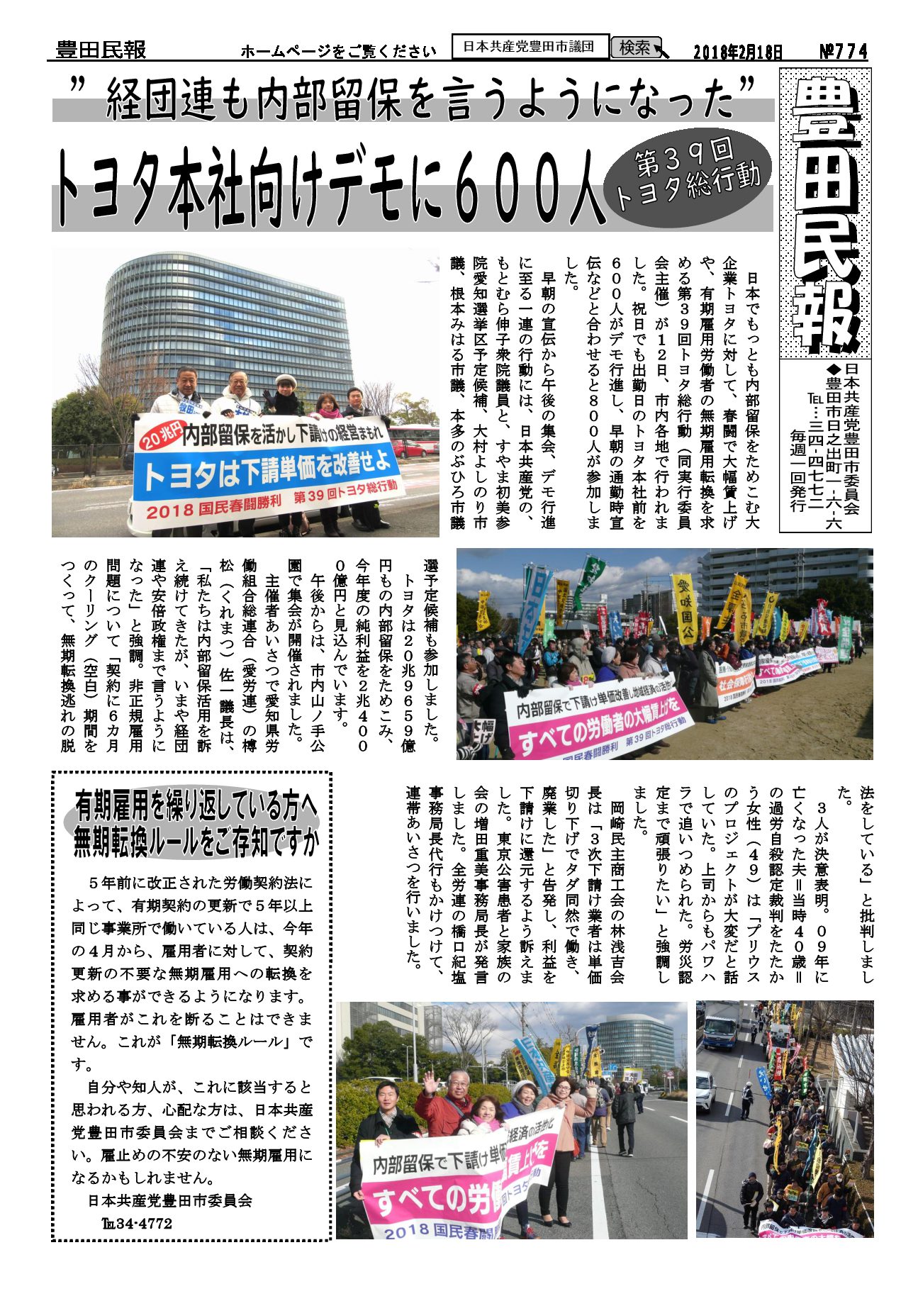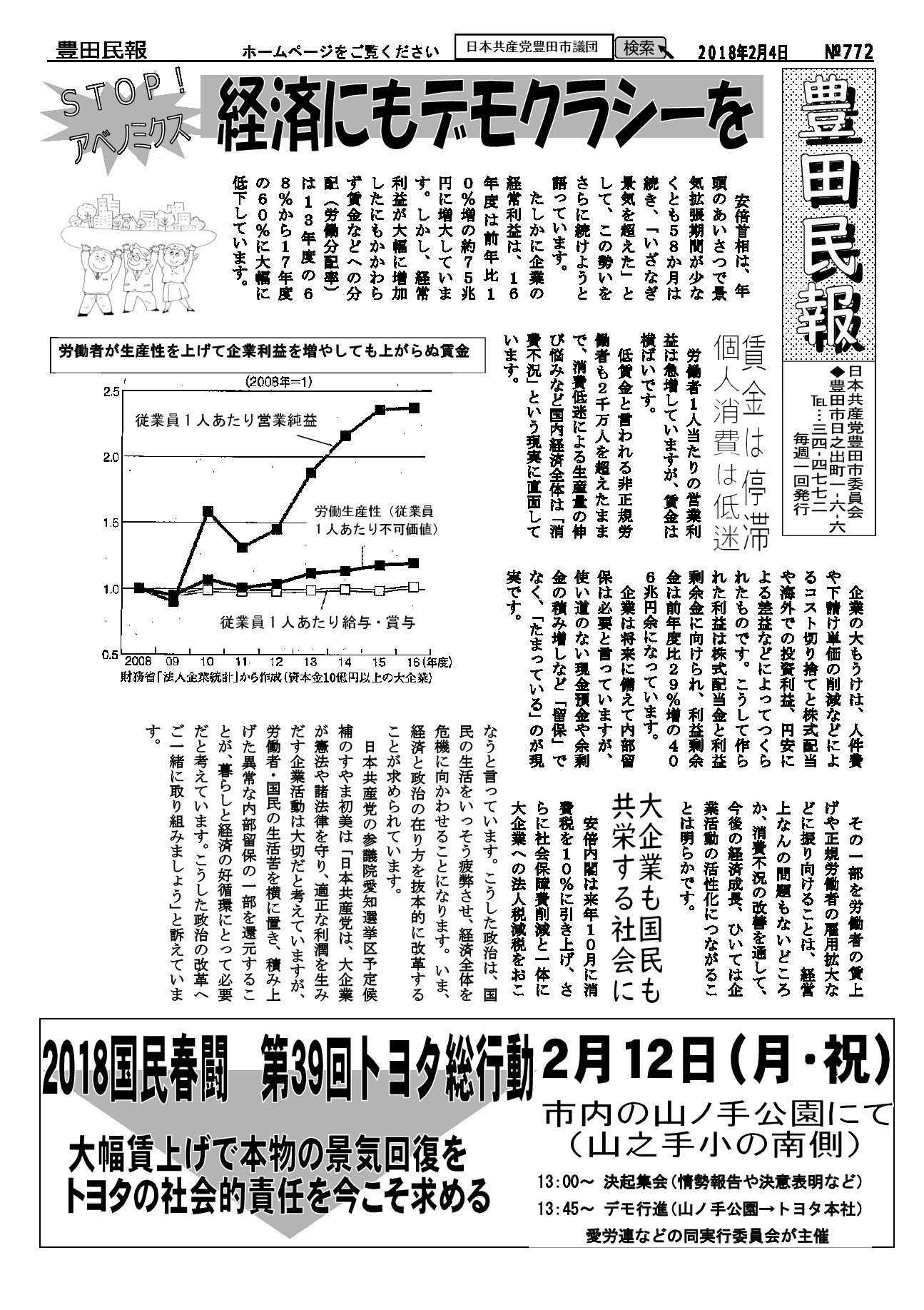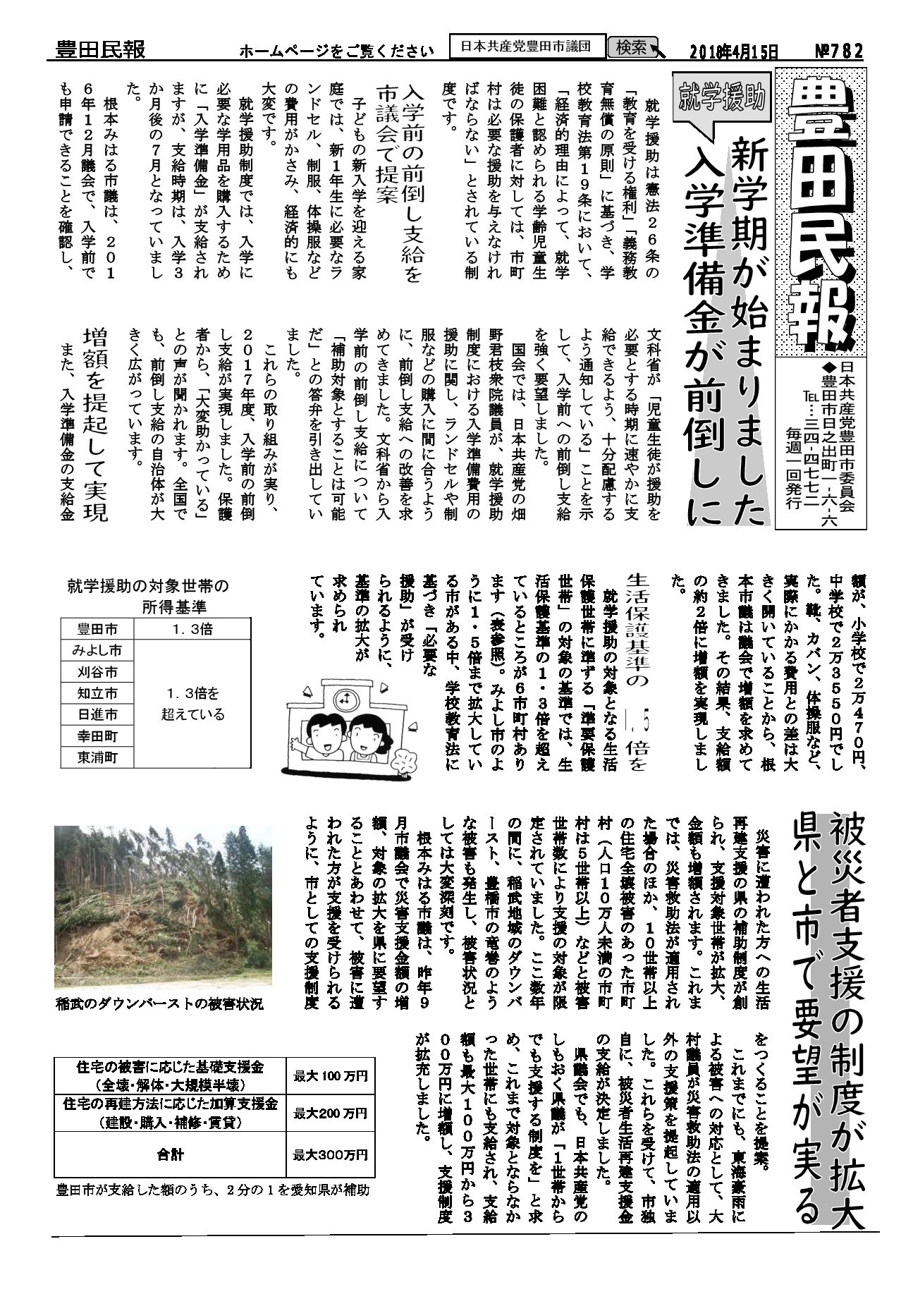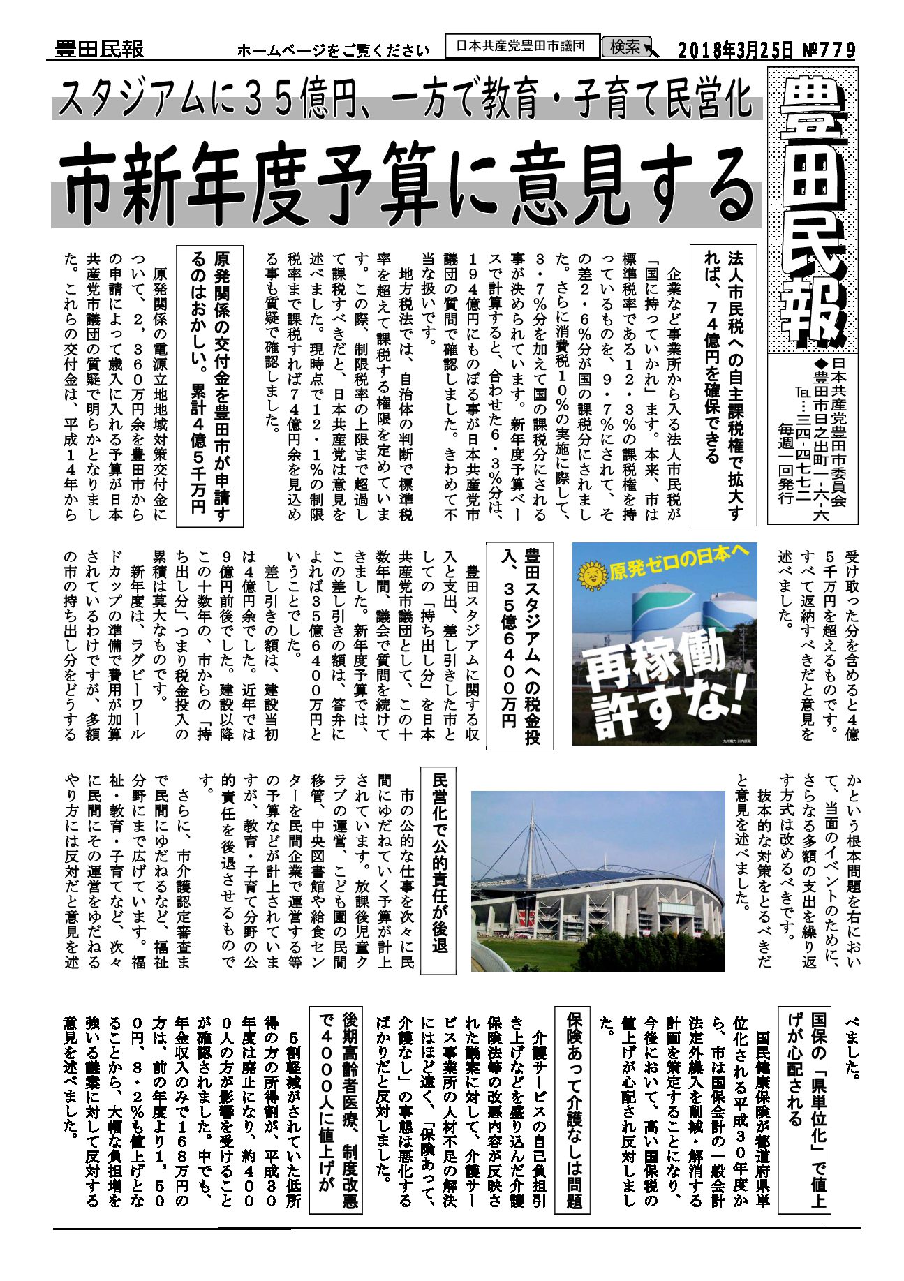 以下をクリックするとファイルが絞り込まれます すべてのカテゴリ 豊田民報 豊田民報号外など 豊田民報 2018.04.27 豊田民報No.783 ダウンロード 2018年4月22日発行。公文書改ざんやデータねつ造など「根腐れ」状態。安倍内閣は総辞職を(733KB) 豊田民報 2018.04.14 豊田民報No.782 ダウンロード 2018年4月15日発行。就学援助の入学準備金が前倒しに。被災者支援の制度、県と市で要望が実る(1MB) 豊田民報 2018.04.05 豊田民報No.781 ダウンロード 2018年4月8日発行。豊田市南部地域に総合病院が開院(799KB) 豊田民報 2018.03.29 豊田民報No.780 ダウンロード 2018年4月1日発行。自民党の池田衆院議員が文科省に圧力(601KB) 豊田民報 2018.03.25 豊田民報No.779 ダウンロード 2018年3月25日発行。市の新年度予算について日本共産党市議団の意見(905KB) 豊田民報 2018.03.19 豊田民報No.778 ダウンロード 2018年3月18日発行。森友学園に関する公文書の改ざんが明らかに。真相の徹底究明を(611KB) 豊田民報 2018.03.10 豊田民報No.777 ダウンロード 2018年3月11日発行。3月議会で根本市議が名鉄バス路線廃止について一般質問(862KB) 豊田民報 2018.03.10 豊田民報No.776 ダウンロード 2018年3月4日発行。3月議会で大村市議が駅前再開発について一般質問(1MB) 豊田民報 2018.02.22 豊田民報No.775 ダウンロード 2018年2月25日発行。3月議会の日程案内。議会傍聴にお越しください(1MB) 豊田民報 2018.02.17 豊田民報No.774 ダウンロード 2018年2月18日発行。トヨタ本社前デモ600人、無期転換ルール説明、すやまさん市駅前宣伝の報告など(1MB) 豊田民報 2018.02.08 豊田民報No.773 ダウンロード 2018年2月11日発行。名鉄バス路線の継続を要請など(1MB) 豊田民報 2018.02.04 豊田民報No.772 ダウンロード 2018年2月4日発行。STOPアベノミクス、経済にもデモクラシーを。在宅医療・介護をどうするか、問われる市の対応(881KB) さらに表示