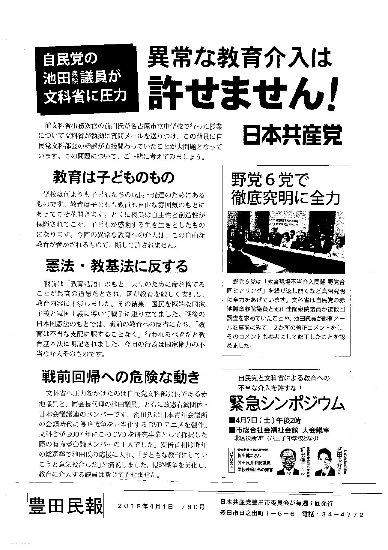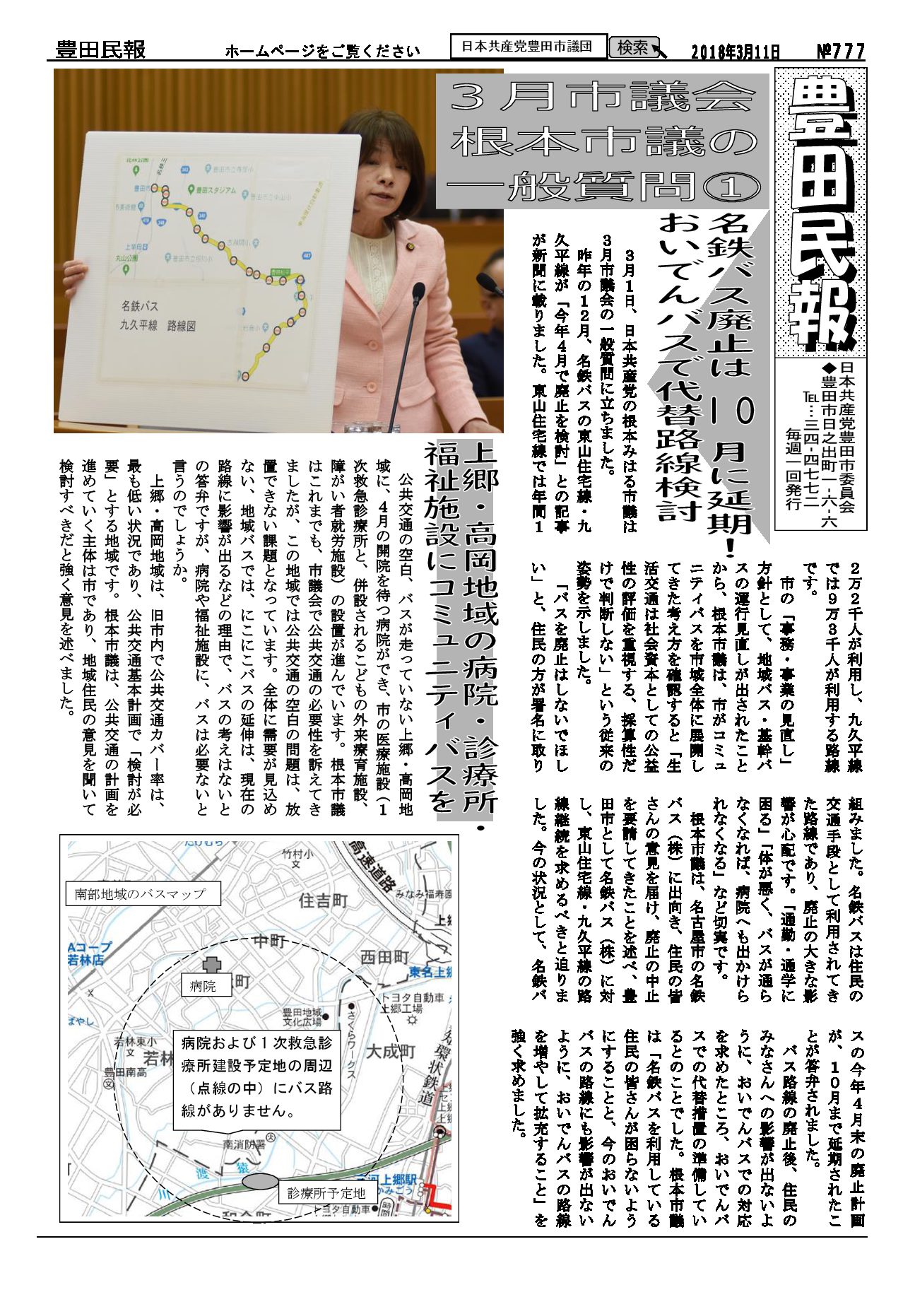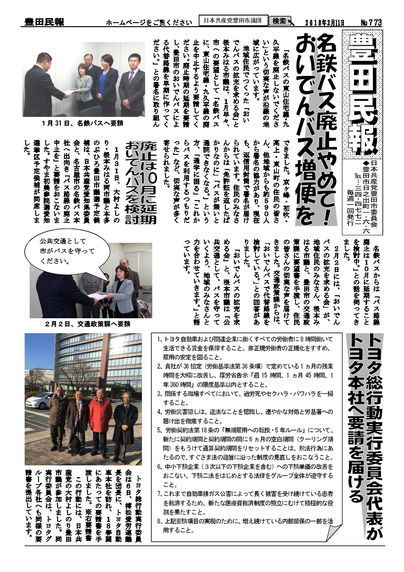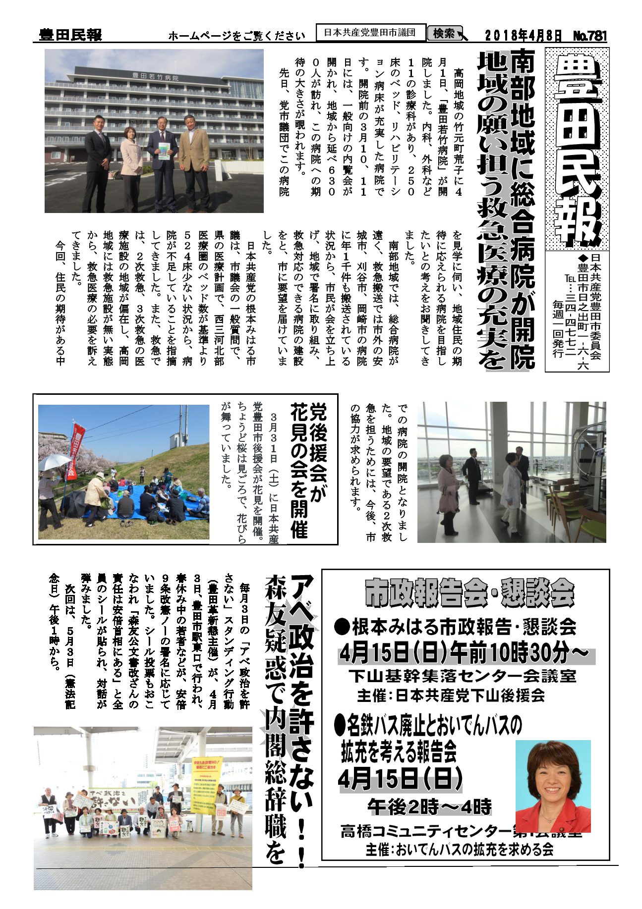 以下をクリックするとファイルが絞り込まれます すべてのカテゴリ 豊田民報 豊田民報号外など 豊田民報 2018.04.27 豊田民報No.783 ダウンロード 2018年4月22日発行。公文書改ざんやデータねつ造など「根腐れ」状態。安倍内閣は総辞職を(733KB) 豊田民報 2018.04.14 豊田民報No.782 ダウンロード 2018年4月15日発行。就学援助の入学準備金が前倒しに。被災者支援の制度、県と市で要望が実る(1MB) 豊田民報 2018.04.05 豊田民報No.781 ダウンロード 2018年4月8日発行。豊田市南部地域に総合病院が開院(799KB) 豊田民報 2018.03.29 豊田民報No.780 ダウンロード 2018年4月1日発行。自民党の池田衆院議員が文科省に圧力(601KB) 豊田民報 2018.03.25 豊田民報No.779 ダウンロード 2018年3月25日発行。市の新年度予算について日本共産党市議団の意見(905KB) 豊田民報 2018.03.19 豊田民報No.778 ダウンロード 2018年3月18日発行。森友学園に関する公文書の改ざんが明らかに。真相の徹底究明を(611KB) 豊田民報 2018.03.10 豊田民報No.777 ダウンロード 2018年3月11日発行。3月議会で根本市議が名鉄バス路線廃止について一般質問(862KB) 豊田民報 2018.03.10 豊田民報No.776 ダウンロード 2018年3月4日発行。3月議会で大村市議が駅前再開発について一般質問(1MB) 豊田民報 2018.02.22 豊田民報No.775 ダウンロード 2018年2月25日発行。3月議会の日程案内。議会傍聴にお越しください(1MB) 豊田民報 2018.02.17 豊田民報No.774 ダウンロード 2018年2月18日発行。トヨタ本社前デモ600人、無期転換ルール説明、すやまさん市駅前宣伝の報告など(1MB) 豊田民報 2018.02.08 豊田民報No.773 ダウンロード 2018年2月11日発行。名鉄バス路線の継続を要請など(1MB) 豊田民報 2018.02.04 豊田民報No.772 ダウンロード 2018年2月4日発行。STOPアベノミクス、経済にもデモクラシーを。在宅医療・介護をどうするか、問われる市の対応(881KB) さらに表示