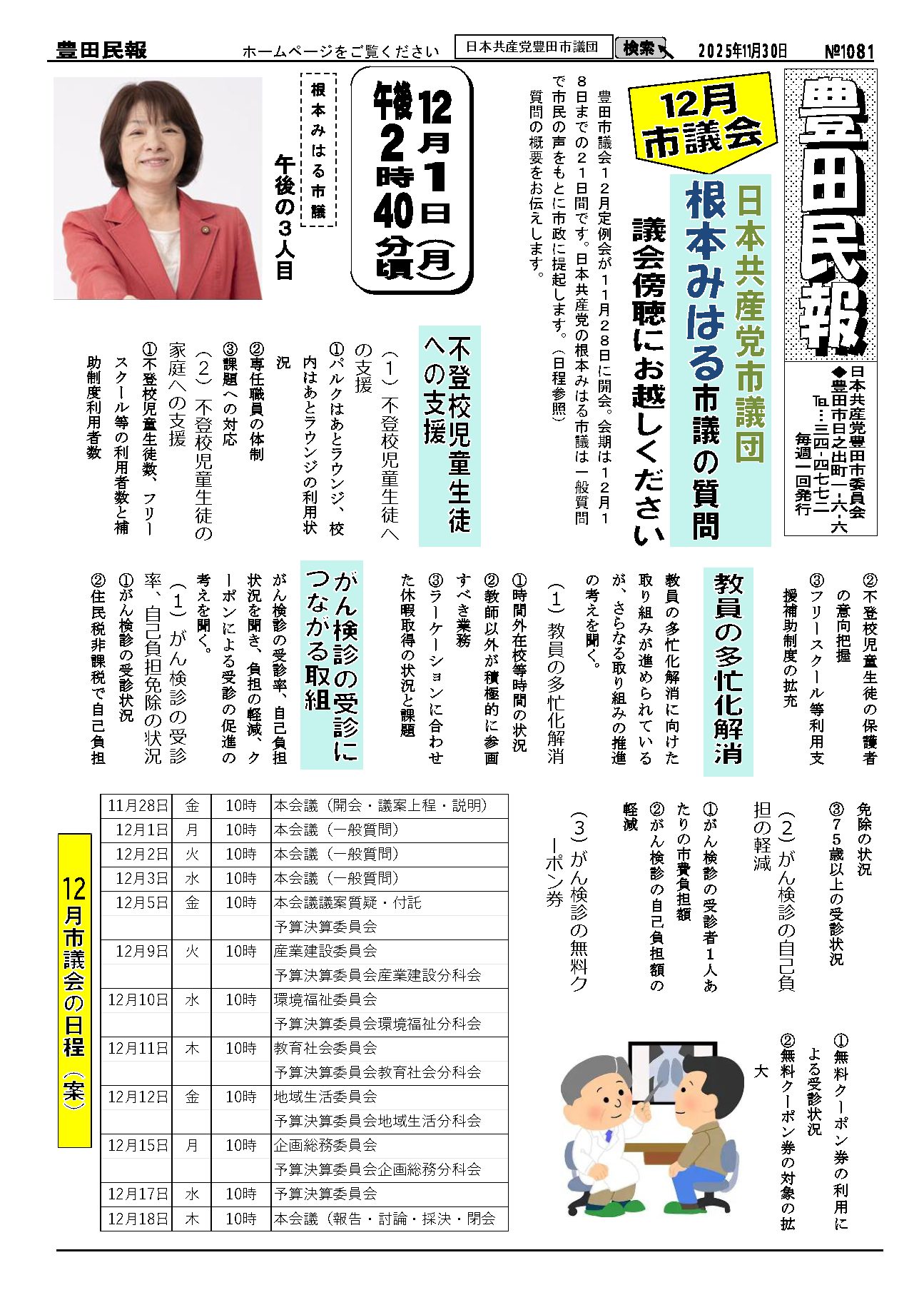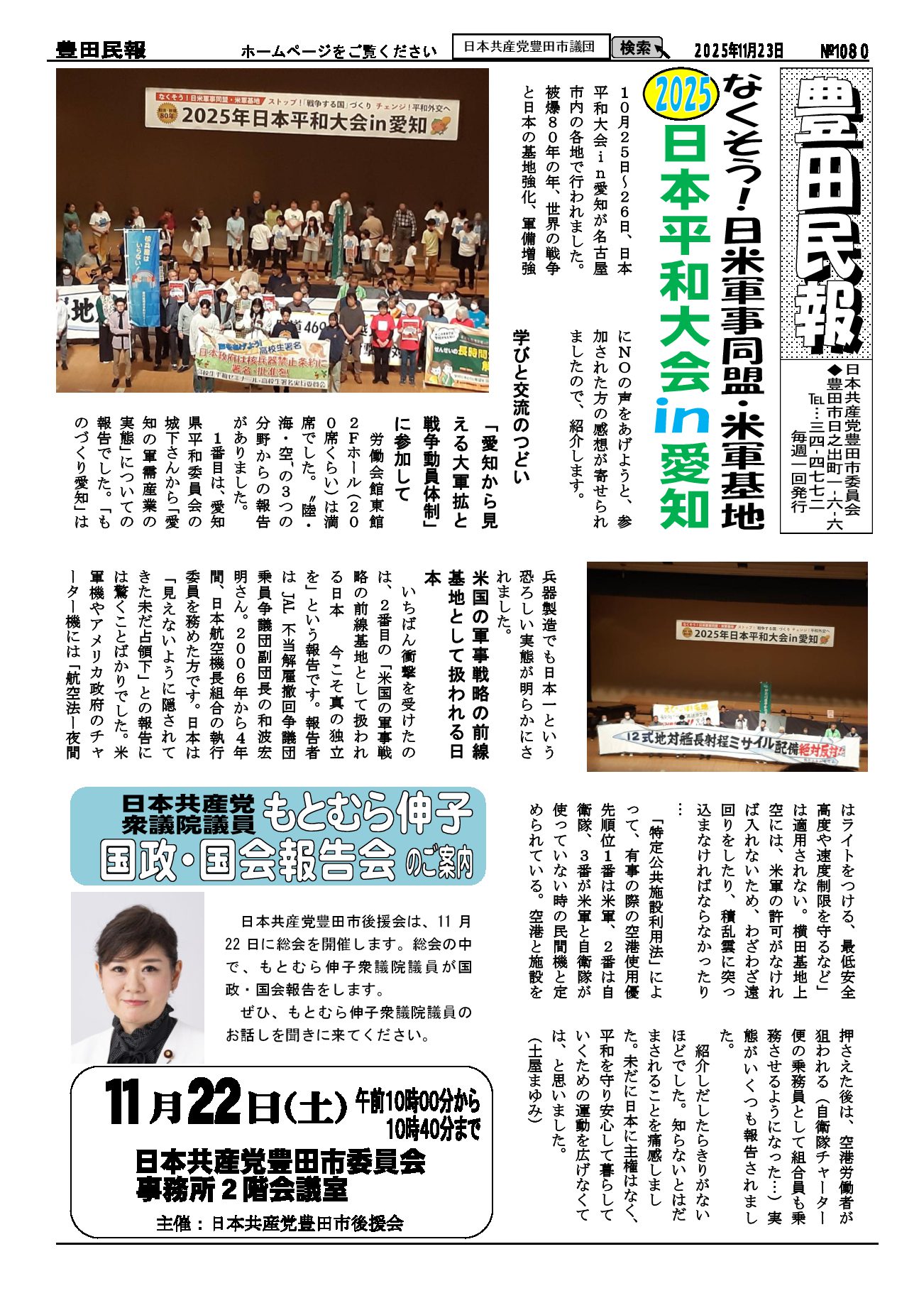 2025年9月21日発行。9月議会 2024年度決算質疑:ラリー・大型事業優先の一方で市民には重すぎる負担増、世界ラリーに8億3,780万円余、豊田スタジアムに8億九千百万円の市の持ち出し、75歳以上の高齢者医療保険料、平均1万3,200円値上げ、障がい者のタクシー券は依然低い利用率:15.9%(金額ベース)。 [投稿]山ノ手公園のせせらぎ、今年の夏も休止。 お知らせ:党創立103周年記念講演会、9月23日(火・祝)14:00~オンライン。 しんぶん赤旗日曜版、電子版(購読料 月990円)が10月2日スタート。