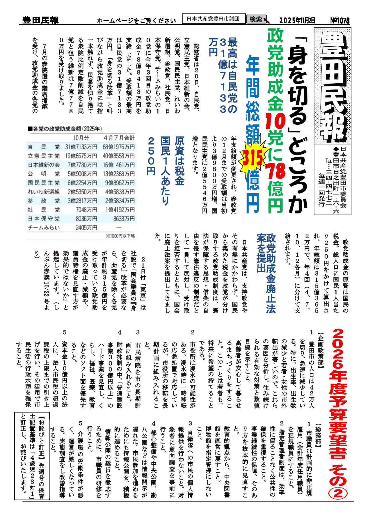 2025年9月21日発行。9月議会 2024年度決算質疑:ラリー・大型事業優先の一方で市民には重すぎる負担増、世界ラリーに8億3,780万円余、豊田スタジアムに8億九千百万円の市の持ち出し、75歳以上の高齢者医療保険料、平均1万3,200円値上げ、障がい者のタクシー券は依然低い利用率:15.9%(金額ベース)。 [投稿]山ノ手公園のせせらぎ、今年の夏も休止。 お知らせ:党創立103周年記念講演会、9月23日(火・祝)14:00~オンライン。 しんぶん赤旗日曜版、電子版(購読料 月990円)が10月2日スタート。