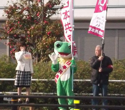 午後からのえぷろん宣伝は、久しぶりにカエル君と宣伝に協力してくれているメンバーと一緒に、議会報告や消費税増税に反対する党の躍進の訴えを行いました。車の中から、また、ツーリングのバイクに乗った若者から、手を振っての声援が送られました。