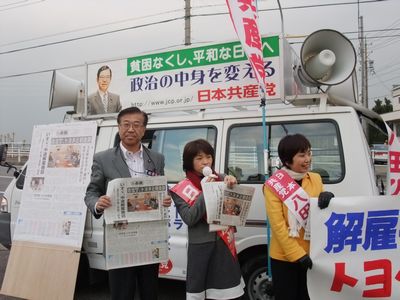 【08.12.25】トヨタの工場門前で「赤旗」紙面掲げて「雇用守れ」の訴え